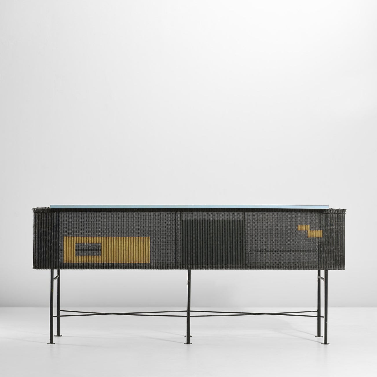 The present free-standing bar by Hungarian-born designer Mathieu Matégot is an eclectic example of his expert ability to work with a range of mediums. He started his career as a set-designer in Budapest before moving to Paris in 1931, where he continued to work until his death in 2001. Many of the furniture pieces he designed from his Paris and Casablanca workshops in the 1950s reveal his knowledge of the properties of fabric and his skills in tapestry, a discipline which he had initially explored and would later return to. In post-war France, where the scarcity of raw materials led designers to be more experimental with their choices of mediums, Mategot’s imaginative creations stood out thanks to his innovative treatment of metal, glass, rattan and more. For metal, Matégot patented a technique of combining perforated sheet metal with metal tubing called rigitulle. This new material he devised envelops the present bar and is seemingly delicate yet durable. Crucially, it was also malleable and allowed him to create effects of transparency and lightness to his pieces. From playful curves to daring punctures, his manipulations of mediums gave his works an appealing tactility.