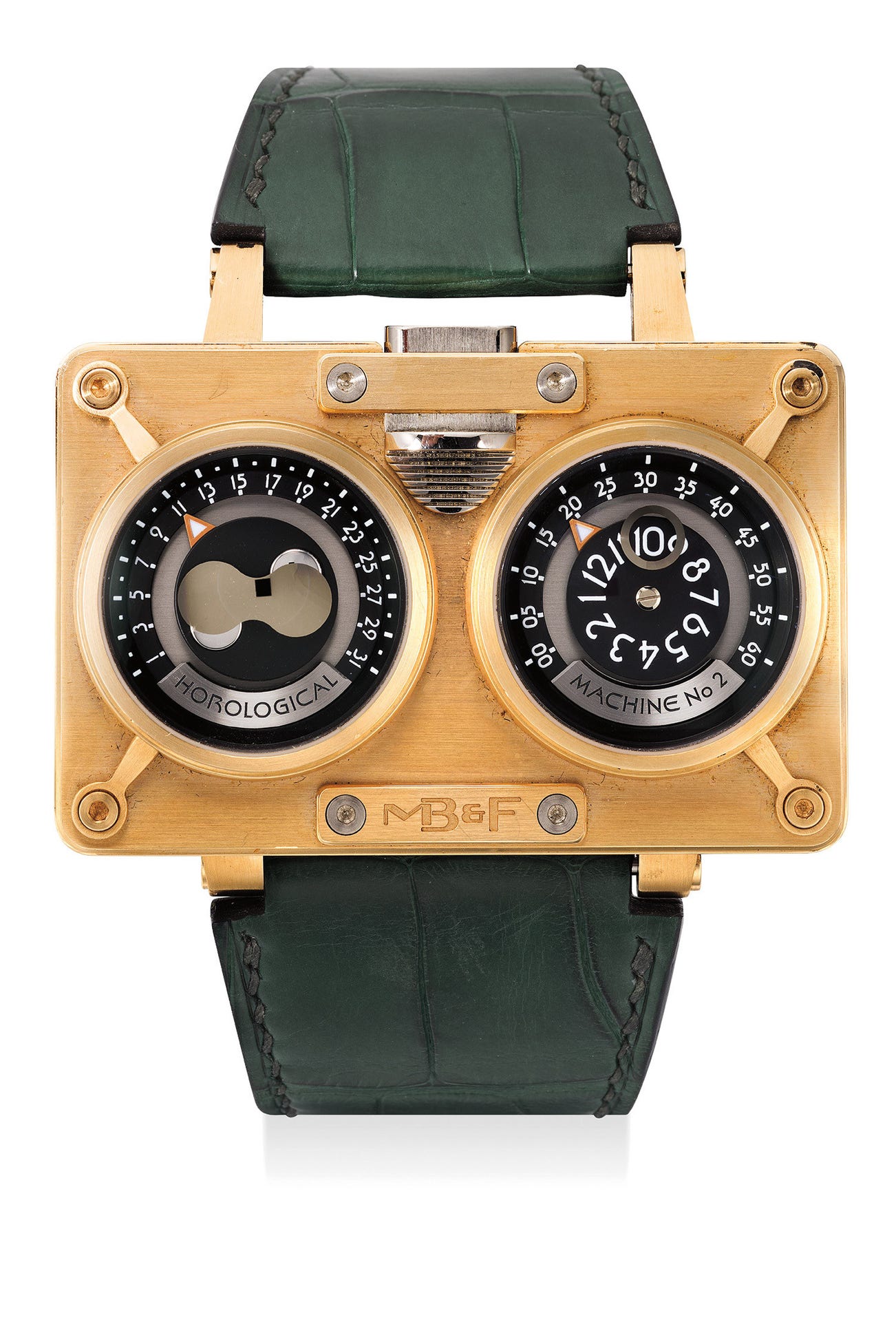 MB & F,「Horological Machine No.2」型號HM2,獨特及罕有,18K玫瑰金長方形自動上弦腕錶,配跳時功能、飛返分鐘、日期和雙半球月相,2008年製。附錶盒和配件