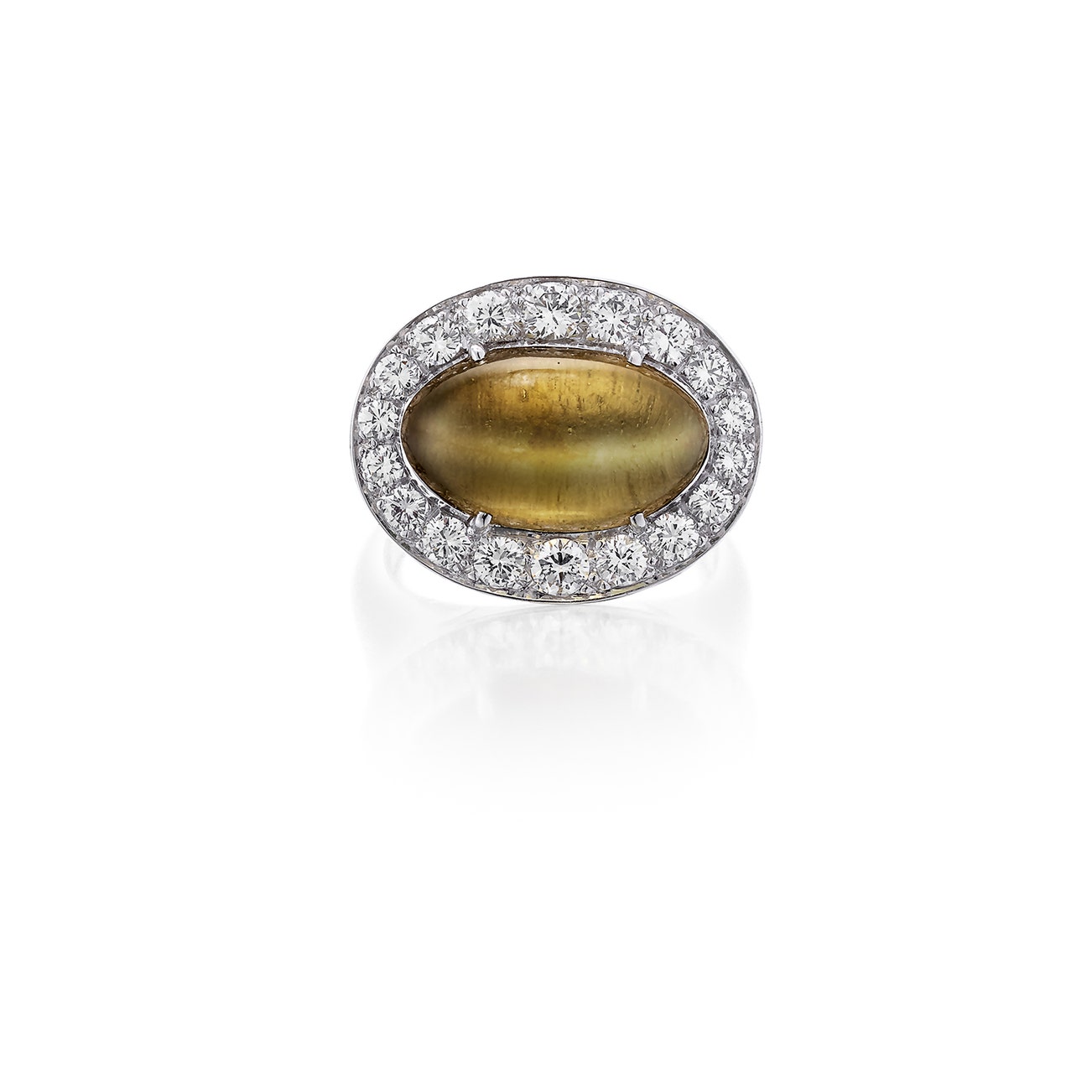 Set with a cabochon cat's eye chrysoberyl, accented with brilliant-cut diamonds, size 55½, signed Meister.