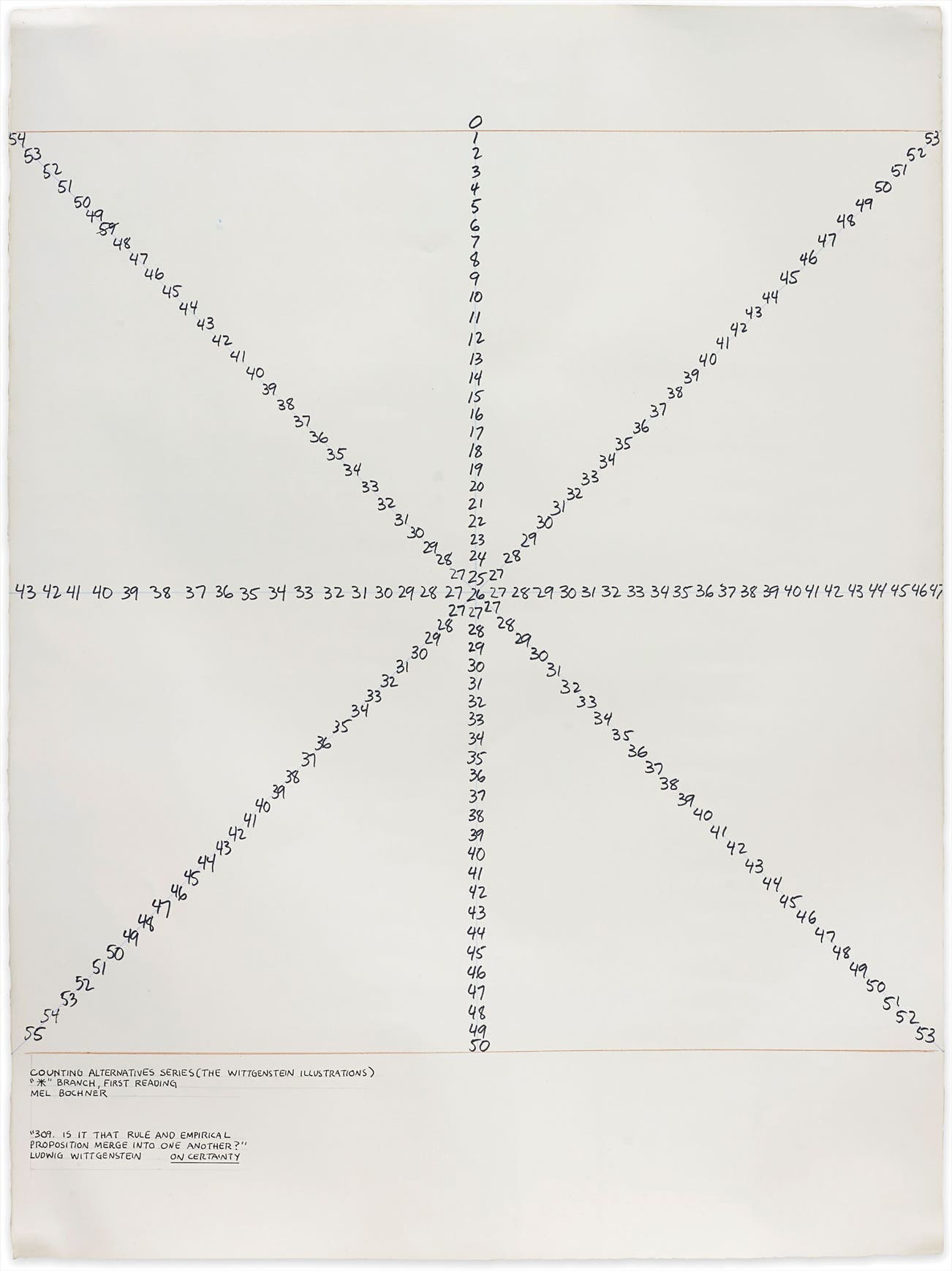 From corner to corner, side to side and up and down, a series of numbers float elegantly across the paper in Mel Bochner’s Counting Alternatives (The Wittgenstein Illustrations), 1972. A pioneer of Conceptual art, Bochner found a level of comfort in the certainty of a grid and within the universal language of numbers, often using only letters or numbers as the aesthetic embodiment of his subject matter. Radiating out like a star from the number 26, both upwards to 53 and down to zero, Counting Alternatives (The Wittgenstein Illustrations), 1972 is Bochner’s artistic attempt to illustrate the famous 20th century philosopher, Ludwig Wittgenstin’s collection of notes, On Certainty.
