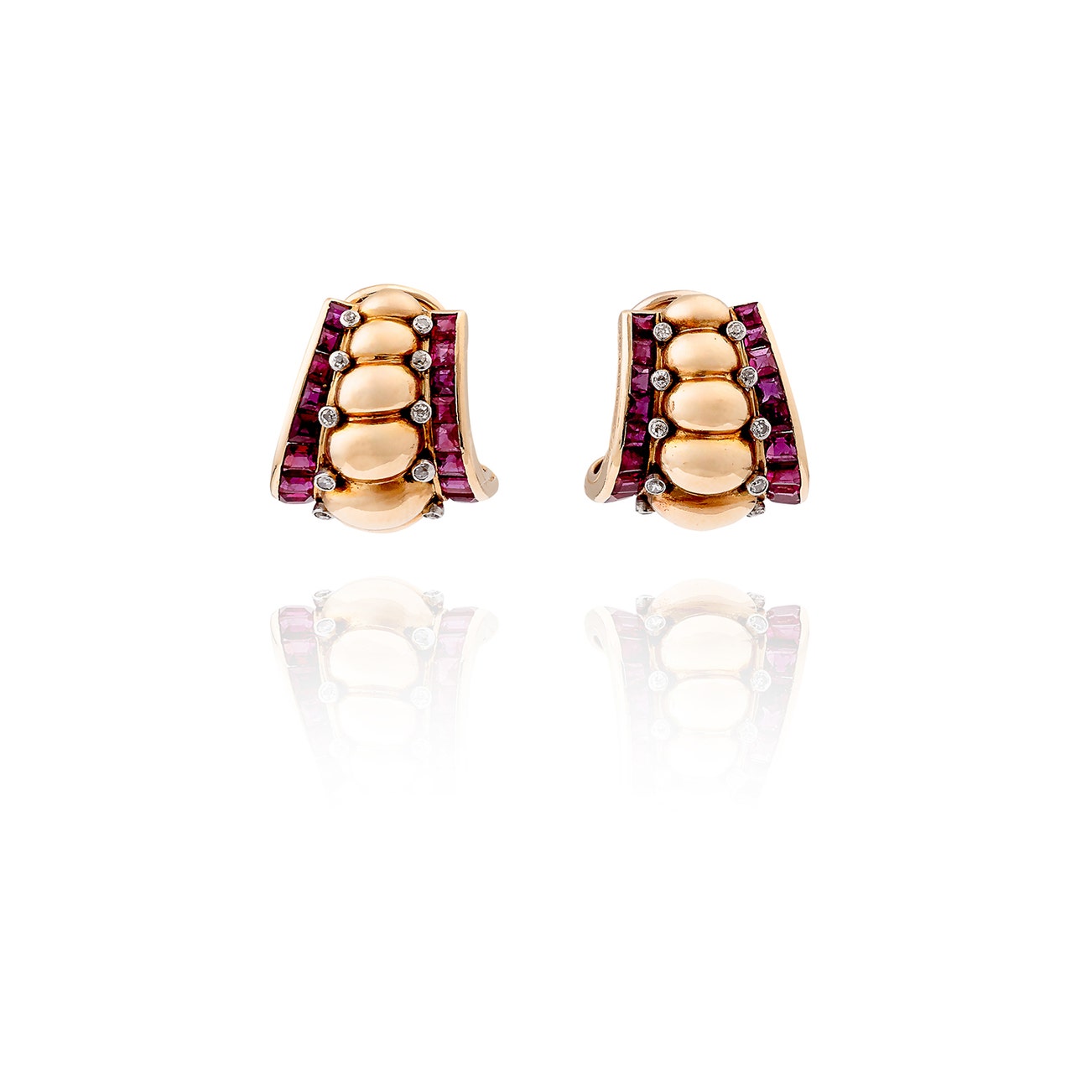 Each set with graduated calibré-cut rubies, accented with circular-cut diamonds, length approximately 15mm, each signed Mellerio, numbered, French maker's mark and assay marks for gold and platinum.