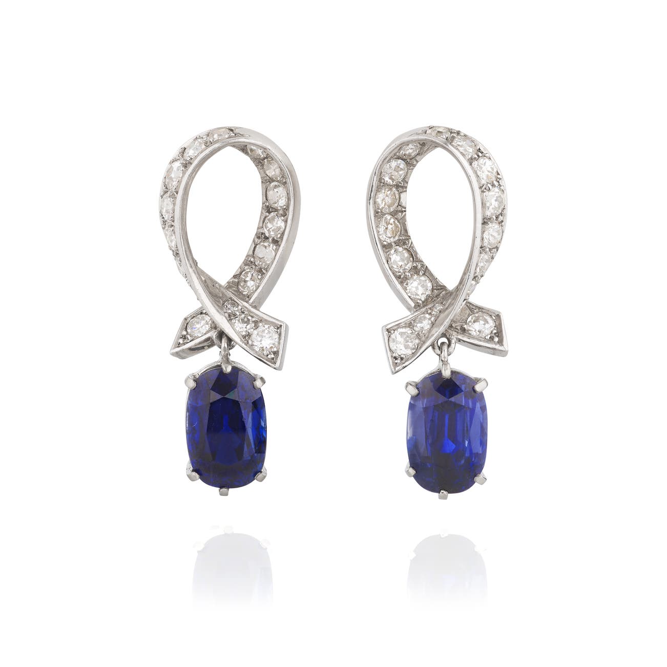 Each of stylized ribbon motif, set with single- and circular-cut diamonds, supporting a cushion-shaped sapphire weighing 4.31 and 5.63 respectively, length approximately 30mm, signed Mellerio, numbered, French maker's mark for Mellerio dits Meller and assay marks for gold.