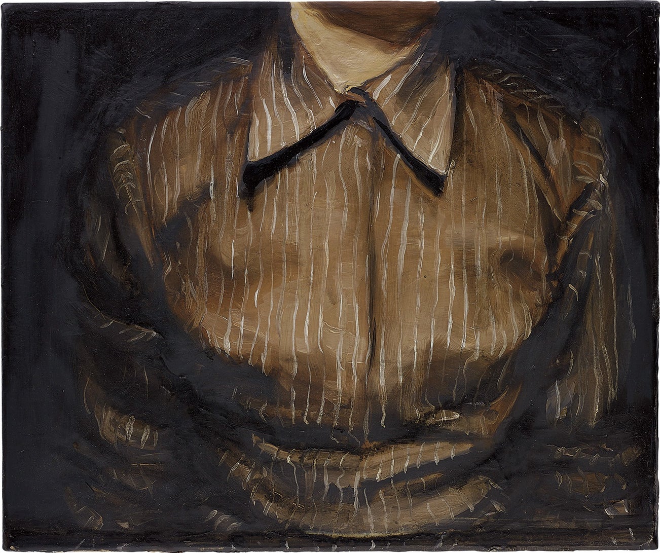 The Shirt, 2002, perfectly typifies the combination of mysterious imagery and painterly virtuosity that propelled Borremans to increasing international fame during this period. Looming out of the darkness, the torso of an anonymous, unidentifiable figure is shown, the image cropped to reveal only a striped shirt. Executed in lushly lavish brushstrokes, Borremans masterful handling of the eponymous shirt ekes out its details - the meandering pinstripes, the deep shadow of the creases and collar, are manipulated within a restrained sepia palette. From the point of view of pure painting, this is a sensual masterclass, a contemporary return to the mimetic, yet expressive detail founded by the Renaissance and Baroque masters of the art historical canon.