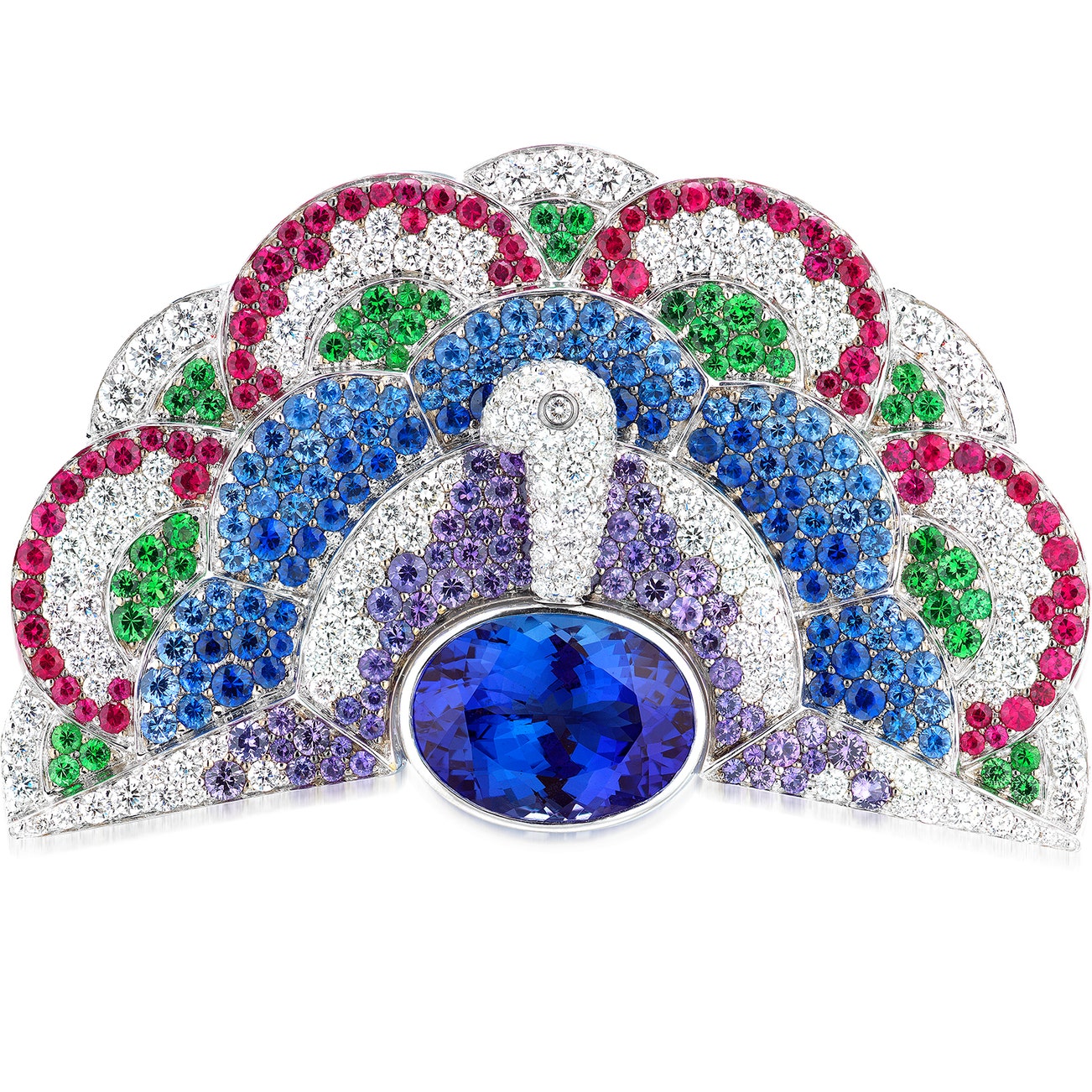 Designed as a peacock, set with an oval tanzanite, circular-cut amethysts, sapphires, amethysts, tsavorite garnets, rubies and brilliant-cut diamonds, mounted in white gold, signed Michele della Valle, numbered, maker’s mark, pouch stamped Michele della Valle.