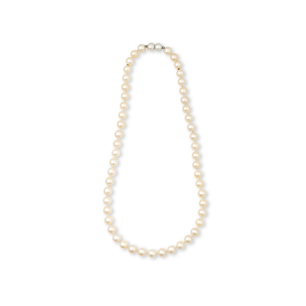 Composed of a single strand of cultured pearls measuring from approximately 7.44mm to 7.88mm, length approximately 452mm, pouch stamped Mikimoto.