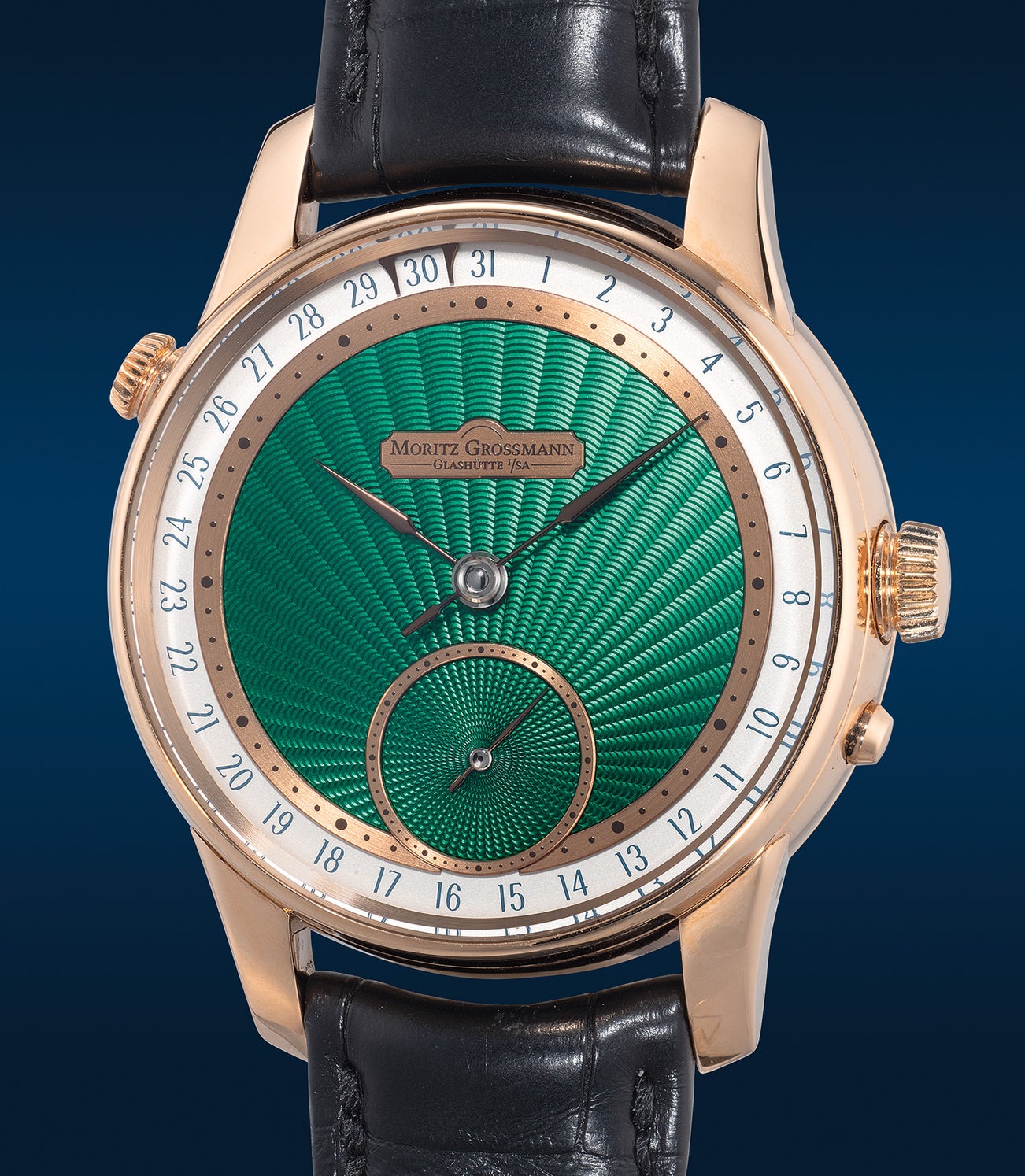 Moritz Grossmann,「Date」型號 MG-003234,精細優雅,獨一無二,玫瑰金腕錶,備綠色「Comblémine von Kari Voutilainen」手工雕刻璣鏤錶盤及日期顯示,約2022年製。附原裝證書、配件、錶盒