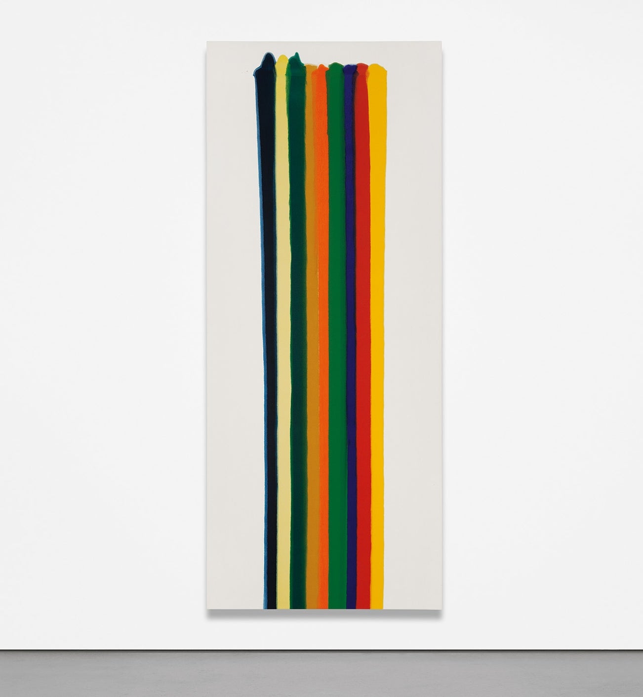 Singing is the outcome of Louis’s idiosyncratic painterly practice: after stapling canvas to his studio wall, he would pour turpentine-thinned paint in a trajectory that was purely ruled by gravity and controlled chance. This staining exercise – executed in Magna, a brand of acrylic resin paint – was primarily inspired by a visit to Helen Frankenthaler’s studio that he and Kenneth Noland took in April 1953, during which the two were astounded by her seminal painting Mountains and Sea, 1952, on extended view at the National Gallery of Art, Washington, D.C. Louis’s material of choice since its creation in 1947, Magna fully penetrates the fabric and engulfs the fibers when applied to unprimed canvas, the artist’s process in Singing and throughout much of his oeuvre. The results of this technique include a heightened brilliance of tone as well as a tendency for the paint to soak through the canvas to the point where the shades are almost as saturated on the verso as they are on the recto of the work. Moreover, Louis never combined the Magna shades for his Stripe paintings, instead utilizing the pure colors straight from the cans, a procedure which accounts for the clarity of the luminescent hues that compose Singing. The painting’s waterfall stripes gracefully demonstrate both the formidable power of gravitational pull and the faculty of the artist’s hand.