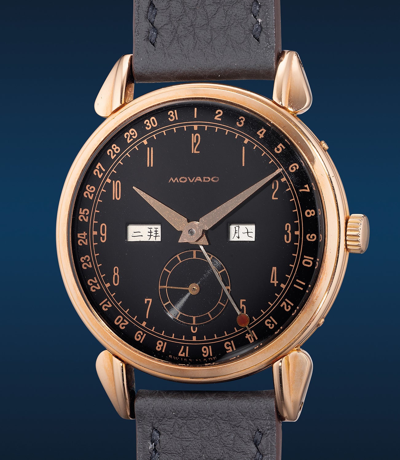 The present subtle pink gold example, however, diverges from its kin with a captivating black gloss dial lavishly decorated with elongated pink gold Arabic indices. Yet the true distinction lies in the Chinese day and month discs, likely destined for the Chinese market. Exceptionally well-preserved for its age, this Movado “Calendograph” is a rare gem ready to grace the collection of a discerning connoisseur.