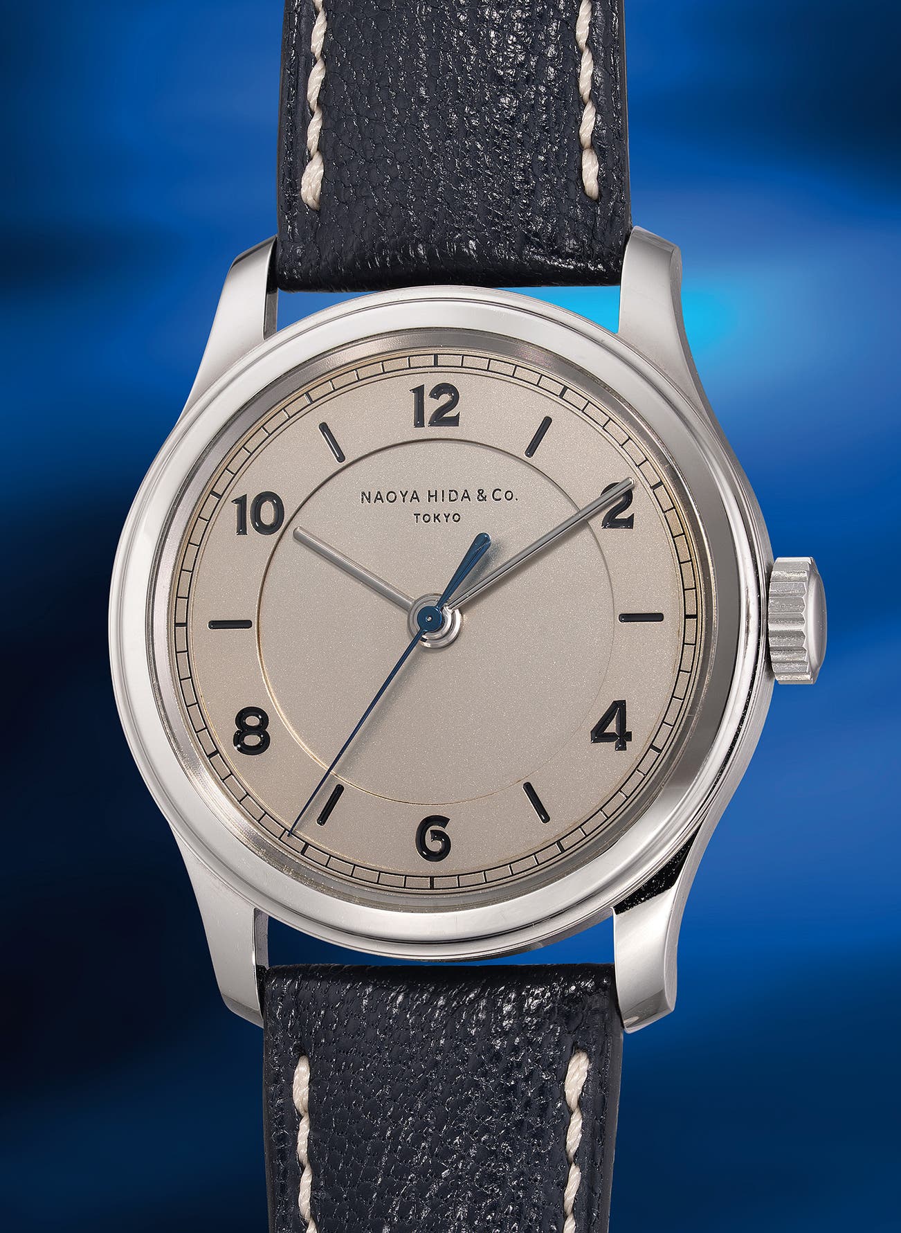 Housed within the sleek 37mm stainless steel case is the Caliber 3020CS, a movement derived from the Valjoux 7750, reengineered without its chronograph function. Although the movement remains hidden behind a solid case back, which was updated in 2022 to a micro-machined screw-in design, it features a newly developed click mechanism that enhances the tactile, vintage-inspired experience of winding the watch. This minimalist configuration reflects the spirit of Japanese independent watchmaking. From 2022 to 2023, the production number of the model totals to 20 pieces only, offered in excellent overall condition, the present timepiece comes with its certificate and is paired with a blue leather strap with ivory lining.