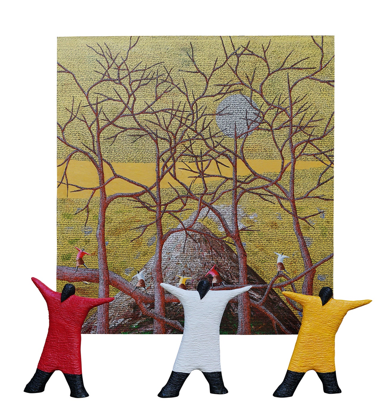 mixed media on canvas; acrylic paint, synthetic wood and synthetic straw