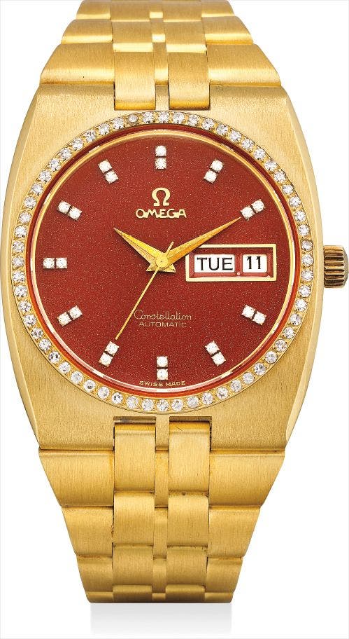 歐米茄,精細及罕有,18K黃金鑲鑽石,酒桶形自動上弦鏈帶腕錶,配中心秒針,“Constellation”,型號BA468.0804,約1979年製