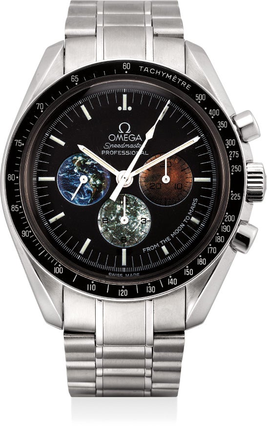 歐米茄,「Speedmaster From the Moon to Mars」型號3577.50,精鋼鏈帶腕錶,配計時功能和採用地球、火星及月球為設計圖案的子錶盤,約2004年製。附錶盒