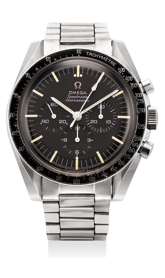 歐米茄,「Speedmaster professional」型號105.012,精細及非常罕有,精鋼鏈帶腕錶,配計時功能,約1967年製。附錶盒、後補證書