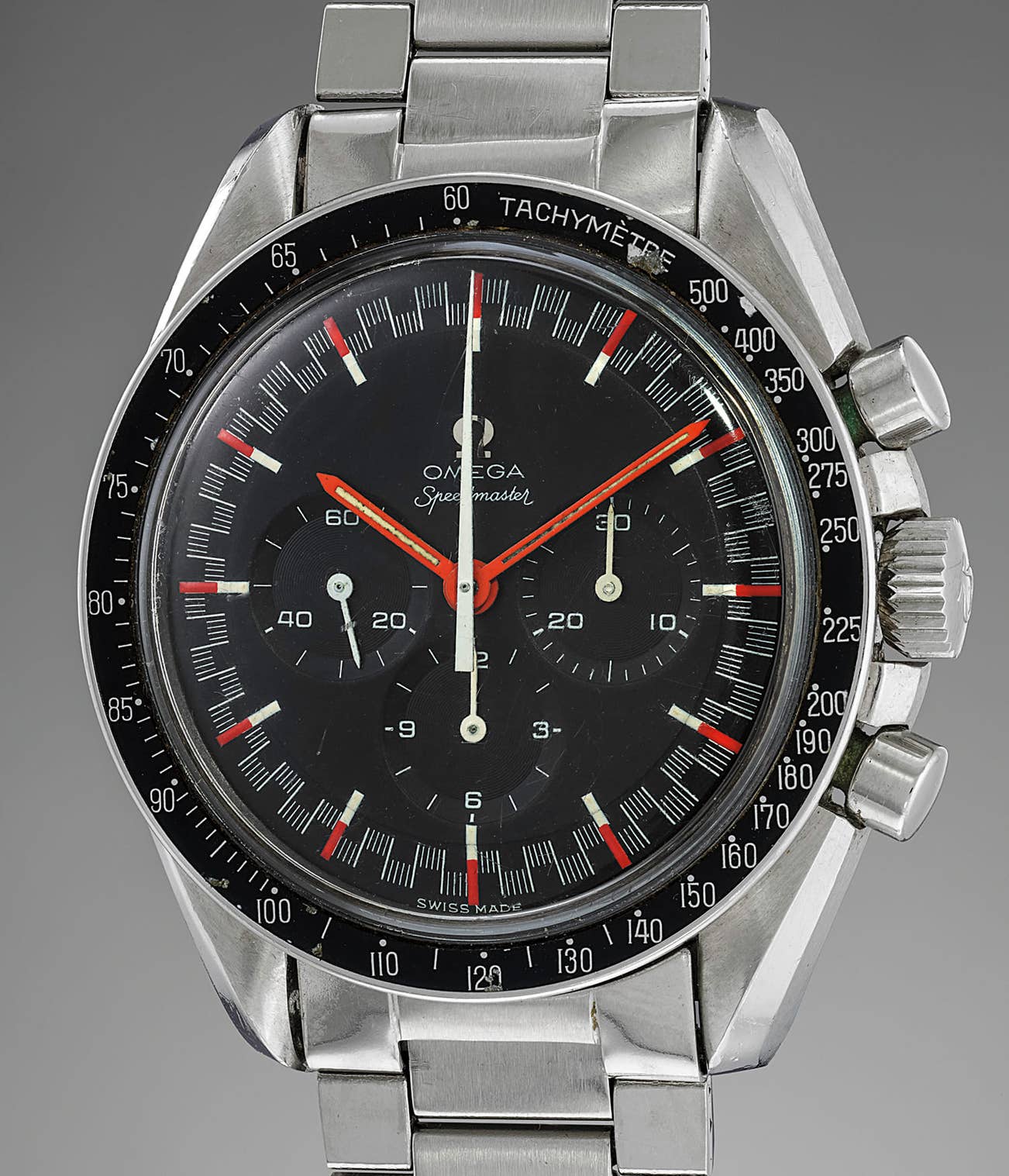 The true appeal of this specimen lies however in its unusual dial configuration, defined chiefly by the red five-minute divisions. Such dials - now known by the Omega community as “Racing Dials” - are extremely rare to find - especially in such flawless condition. Beyond their aesthetic appeal and rarity, they also represent one of the extremely scarce examples of Speedmaster dials featuring other colors than black and white.