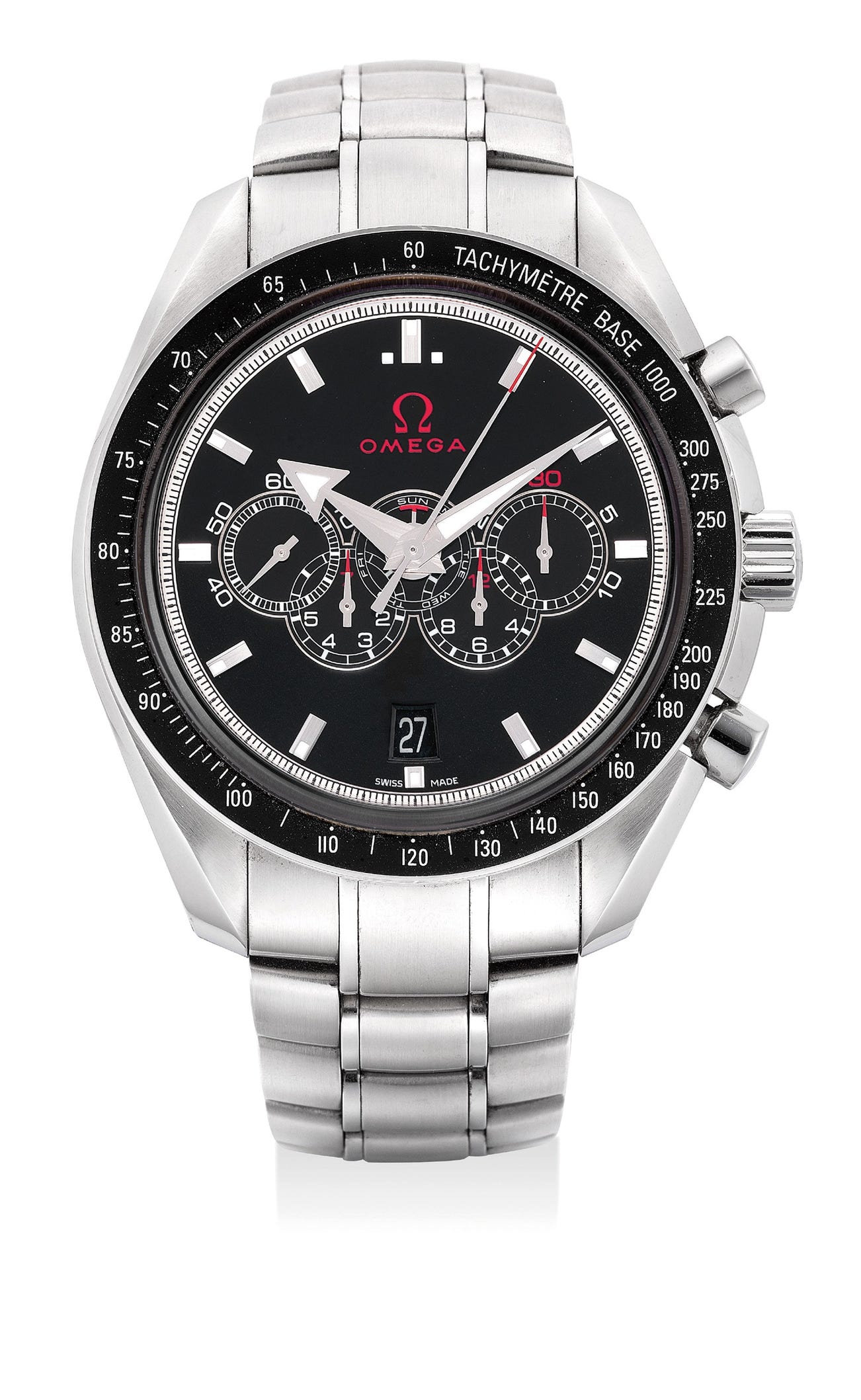 歐米茄,「Speedmaster Broad Arrow, Olympic Games」型號32130445201001,精鋼自動上弦鏈帶腕錶,配計時功能﹑30分鐘和12小時計時盤、7天累計器﹑日期及星期顯示,2008年製。附原裝保證書、錶盒和配件