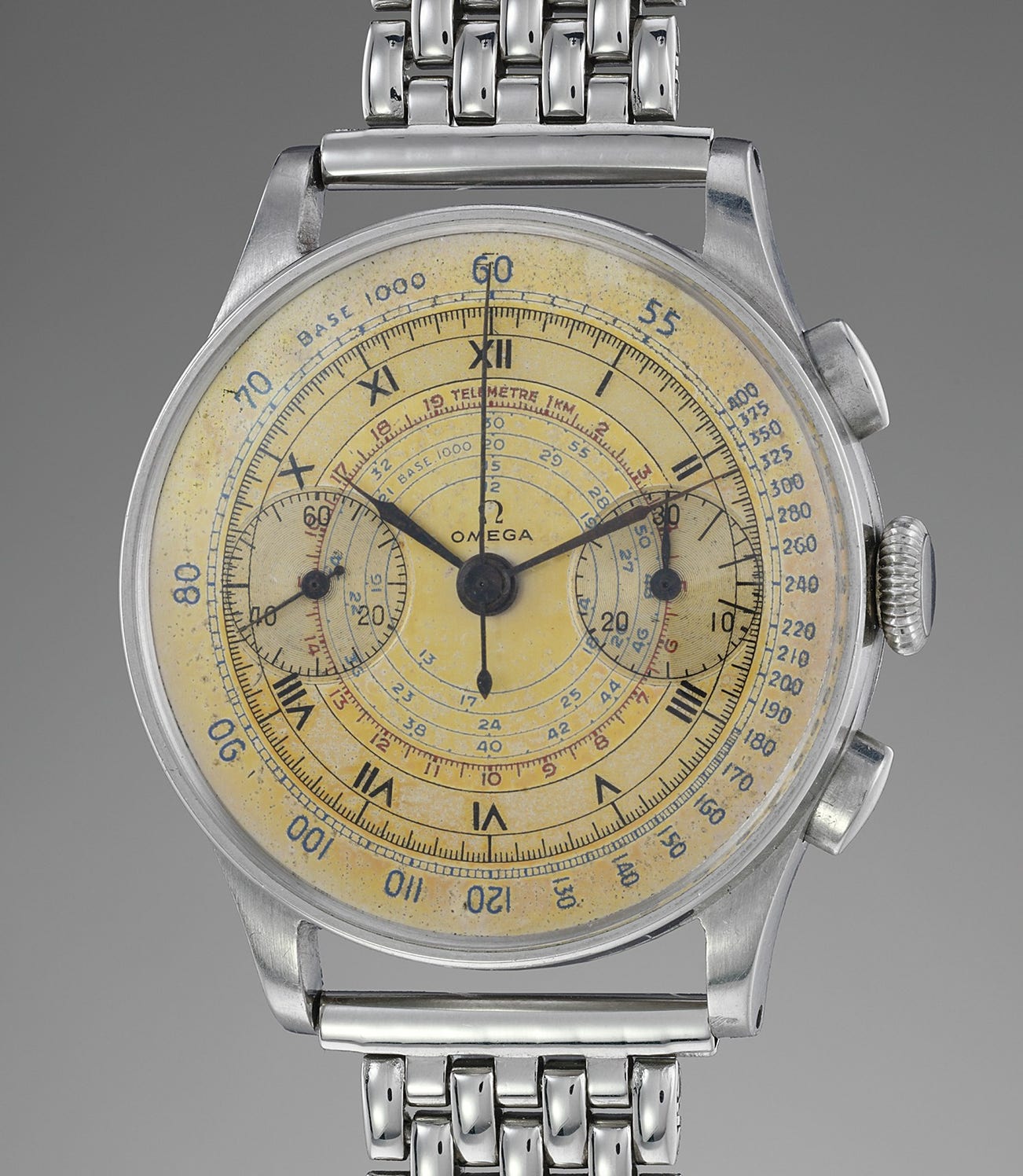 The present lot is fitted with a very attractive multiple scales dial. Apart from its iconic movement, the charisma of this extremely appealing watch lays in the patina displayed on the dial. With the effect of passing years, the watch face has turned to a warm almost yellow gold color. Some age spots, evenly spread on the surface further adorn the dial like stars in the sky. A strong case with sharp lugs and olive pushers secures this testimony of time like a frame protect a painting.