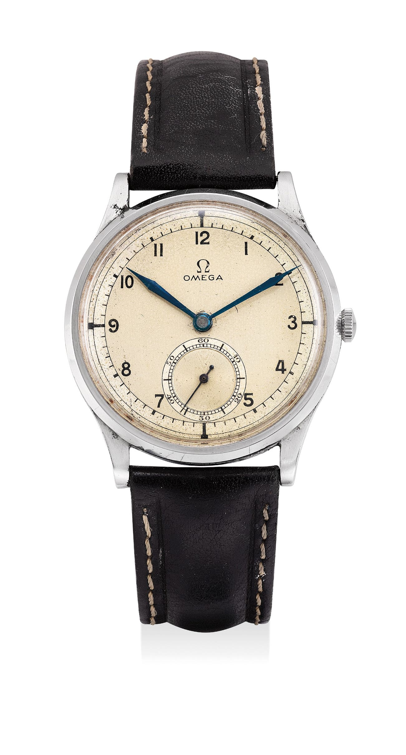 歐米茄,精細,古董精鋼小三針腕錶,配「Two Tone」扇面錶盤和藍鋼指針,約1939年製