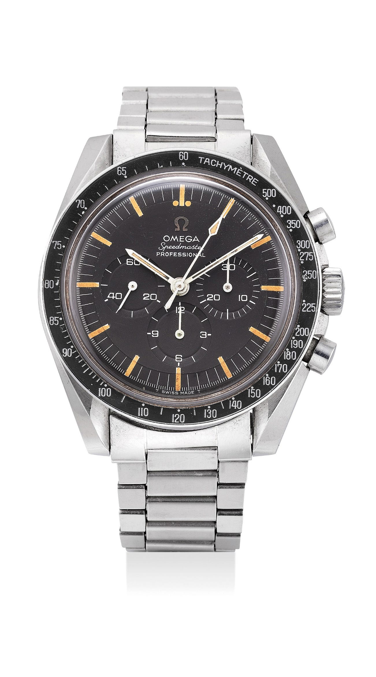 歐米茄,「Speedmaster」型號105.012-66,精細,精鋼計時鏈帶腕錶,1967年製。附後補證書
