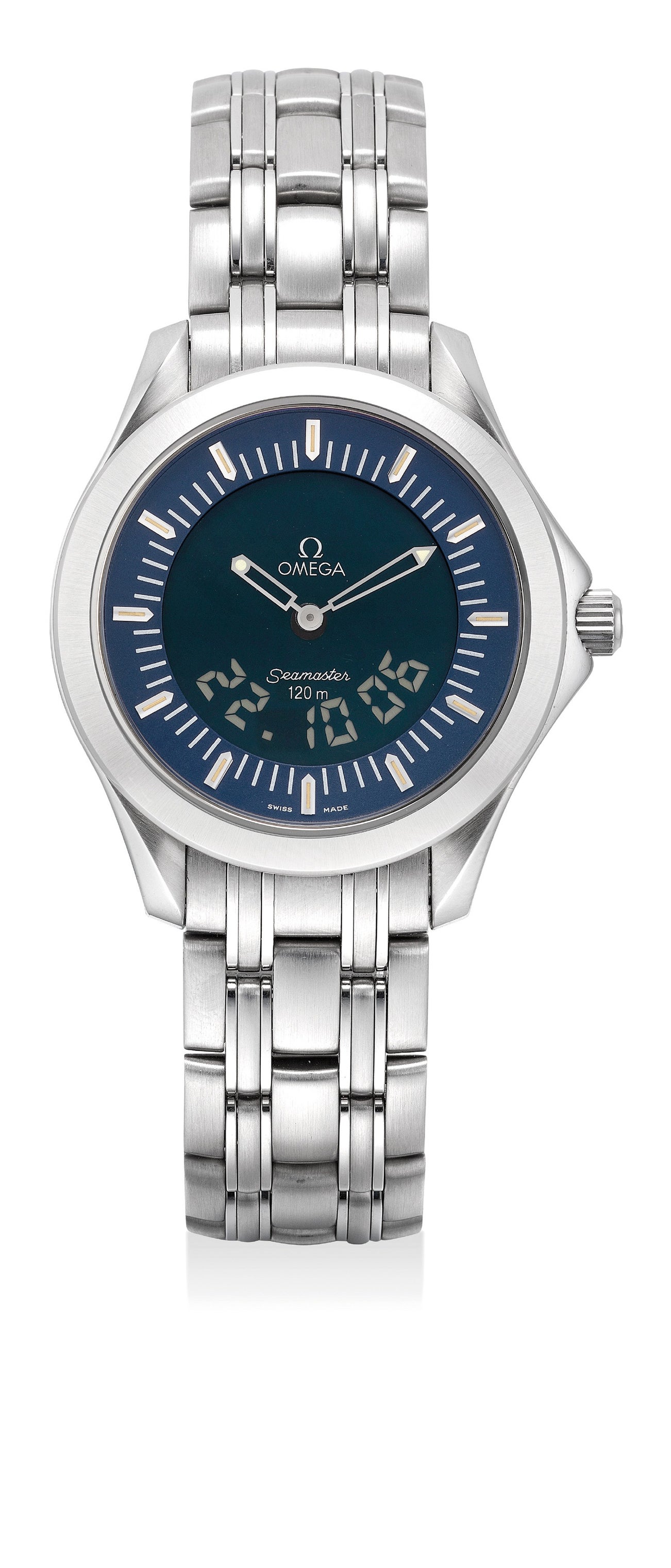 歐米茄,「Seamaster 120m」型號ST 386.150.1,精鋼電子腕錶,配第二時區、計時功能、響鬧和到數功能,約1995年製。附錶盒和證書