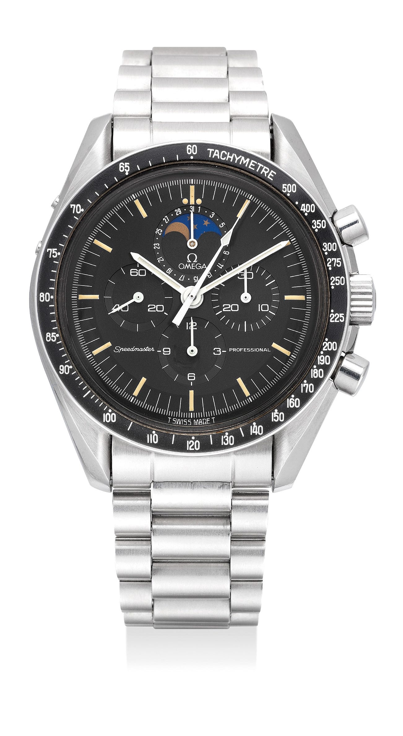 歐米茄,「Speedmaster Speedymoon」型號ST 345.0809,精細及罕有,精鋼鏈帶腕錶,配計時功能、日期、月相, 1988年製。附錶盒