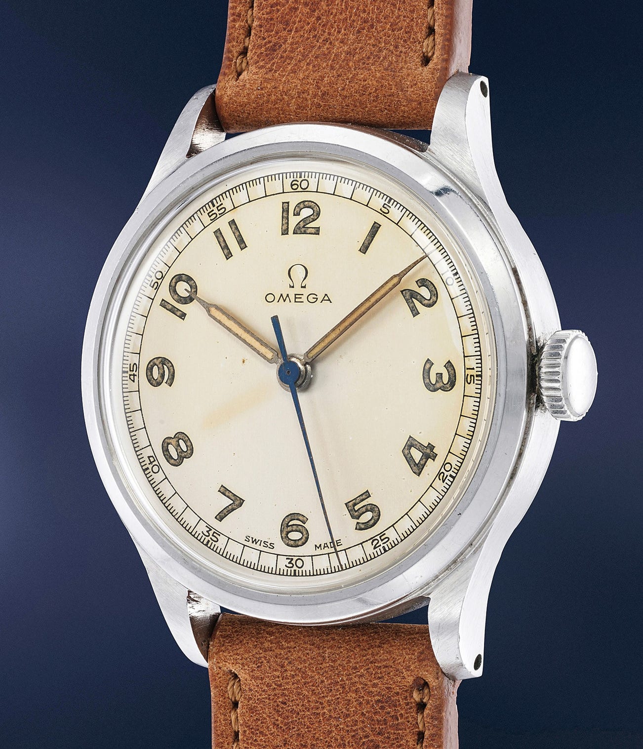 Omega’s reference 2179 was produced for both civilian and military purposes in the early 1940s, and its overall design upholds those basic tenets of early military watch specifications. Designed with an elegantly simple and legible luminous dial with sweeping center seconds to avoid clutter, a screw-down caseback, and a brushed steel case rather than polished steel. The syringe hands are seen on other military wristwatches of the era; however, the radial numerals are quite unusual. Within the watch beats the calibre 30T2, also used in the “Dirty Dozen” military watches issued to U.K. armed forces. The present watch is the best-preserved example to have appeared on the market in recent memory, with the dial having aged beautifully over time and the case remaining sharp and unpolished. As confirmed by Omega, the current reference 2179/2 was produced in 1945 and delivered to the U.S. Army – in accordance with the crisp “U.S. Army” engraving found on its caseback. To have survived seven decades in such a state of preservation is a rare treat for the discerning collector of military watches.