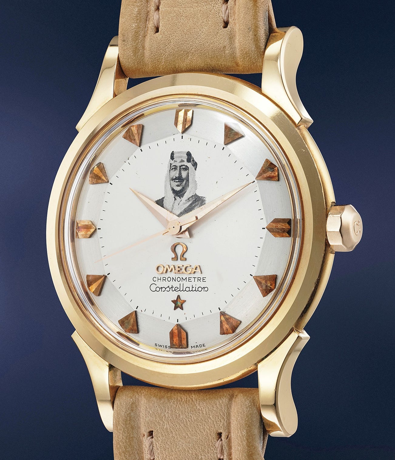 The present example is obviously and immediately set apart from the rest due to its bespoken dial bearing the effigy of the King of Saudi Arabia. Clearly a special order, this watch is an example of bespoken royal timepiece, a custom relatively widespread among middle-eastern crowned heads.