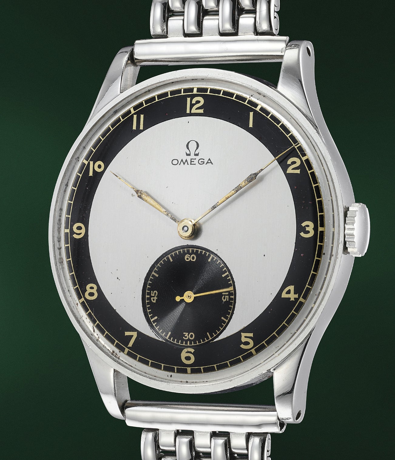 With a 38mm diameter and a dial that is as aesthetically striking as its is rare and interesting, the present watch represents an ideal everyday companion for the vintage watch enthusiast. The dimension classifies it without a doubt as oversize for the era, but it is instead perfectly in tune with today's fashion. The dial, beyond the enormous impact achieved by the contrasting black chapter ring with gilt numeral, follows a sectorial architecture and features the aforementioned gilt graphics as well as on outer railway track and a subdial at 6 o'clock with azurage finish, all traits eminently typical of mid-century watch design and highly coveted by collectors.