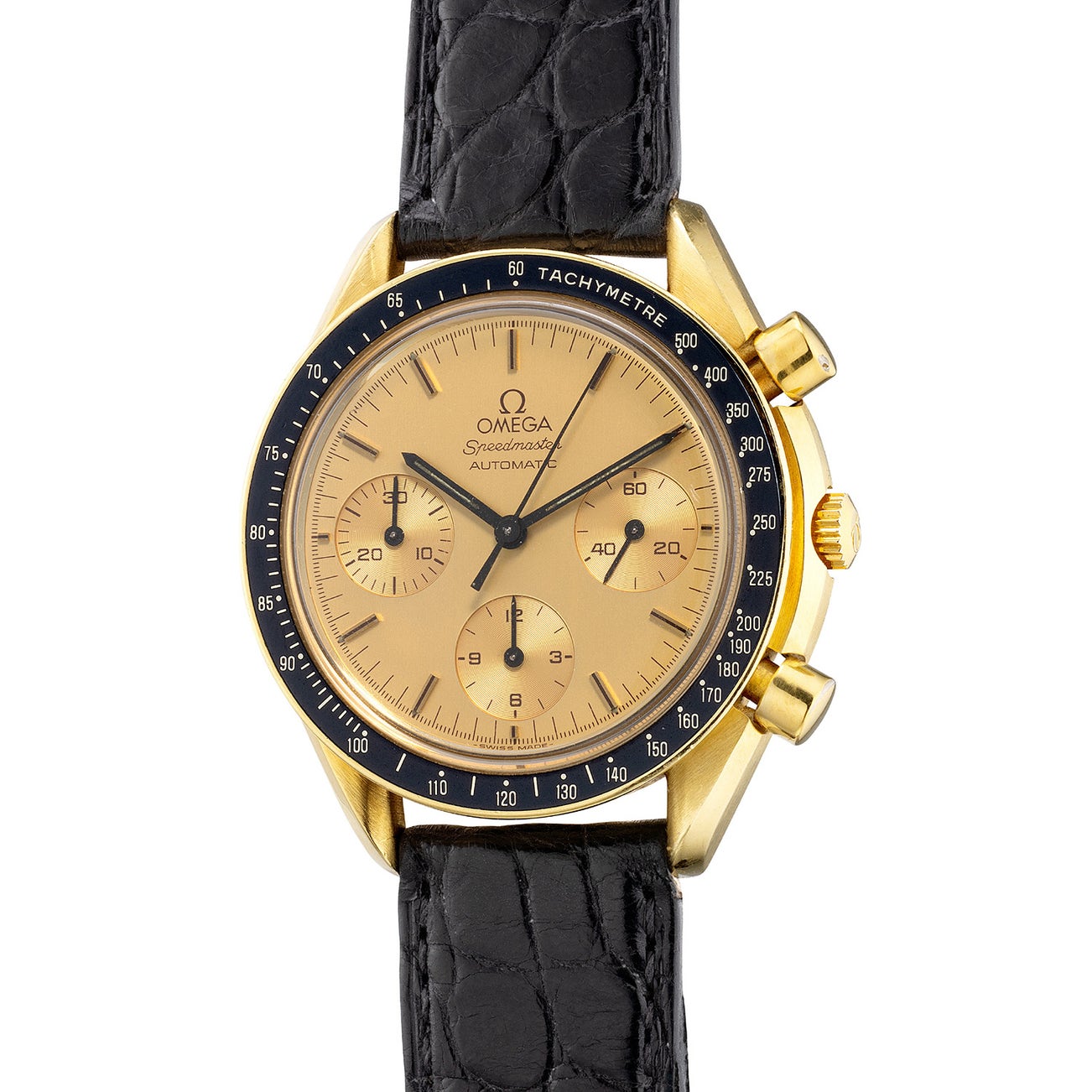 歐米茄,「Speedmaster Reduced」型號BA175.0032,精細,18K黃金自動計時腕錶,約1989年製。附後補證書