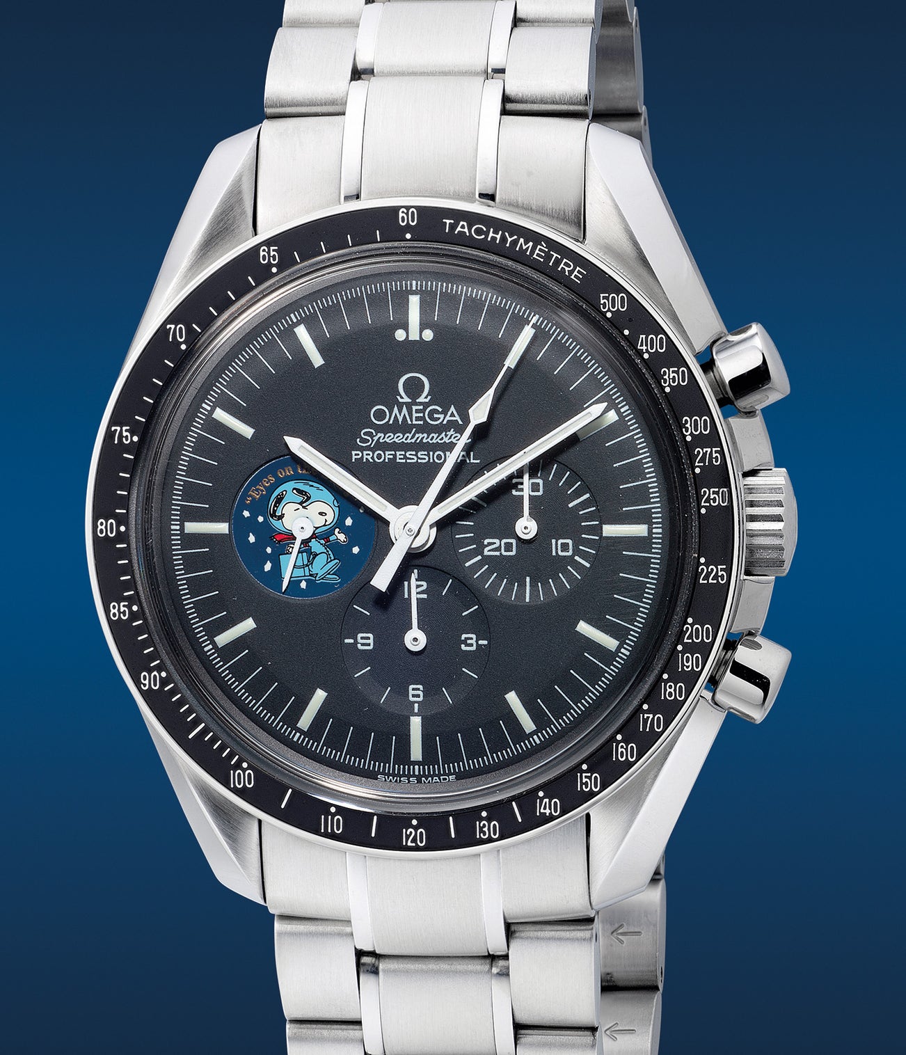 歐米茄,「Speedmaster Professional, "Snoopy Award"」型號145.00.31,罕有,限量版精鋼計時鏈帶腕錶,特為紀念歐米茄榮獲「史努比獎」限 量發行5,441枚,編號第555號,約2004年製。附原裝證書和錶盒