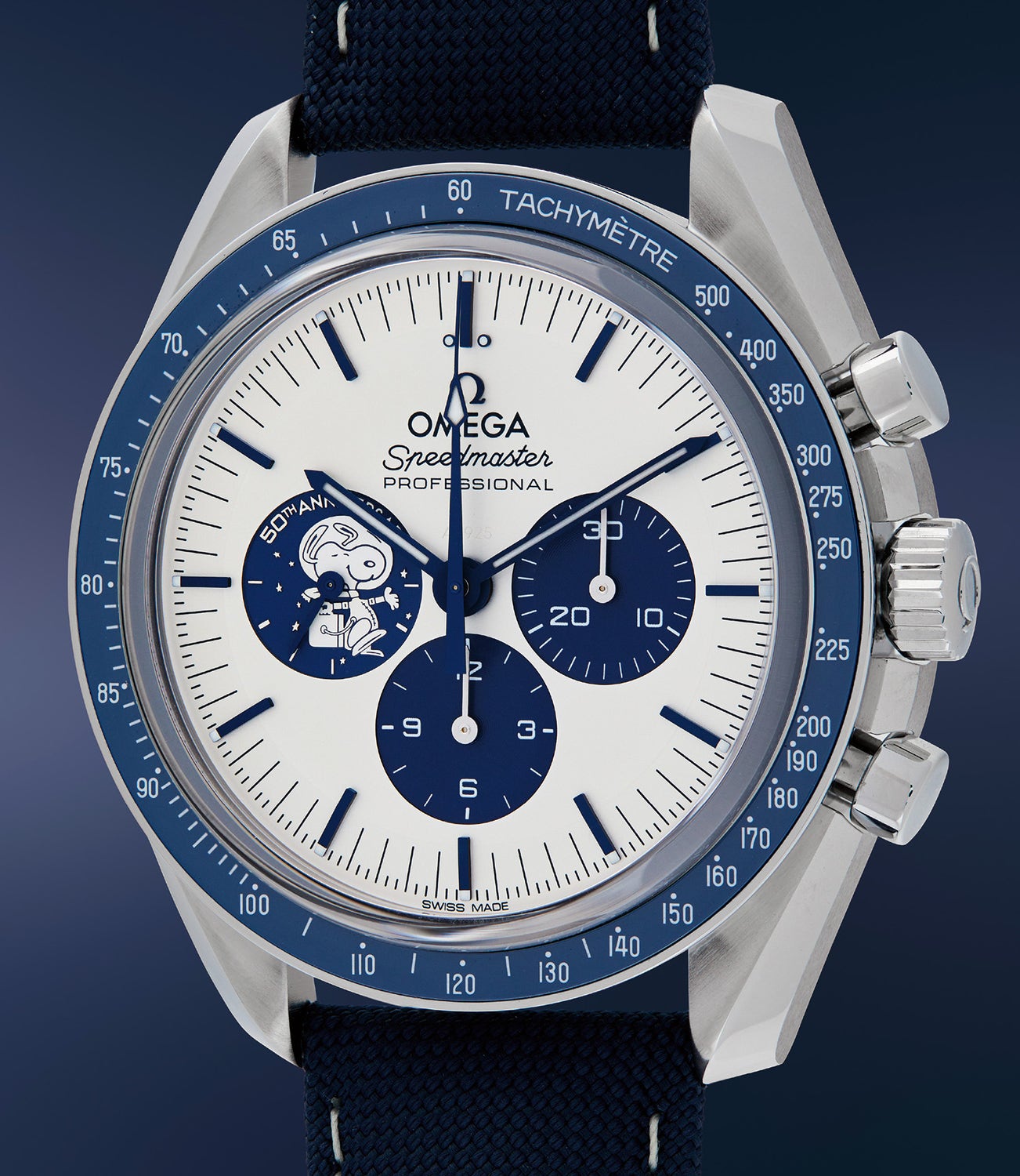The 2020 edition retains the Speedmaster Professional design with the case-shape reminiscent of the late 1960s model ST105.012. NASA’s favourite beagle again adorns the dial, while through the sapphire caseback, one sees a whimsical mechanical animation. The chronograph features a “Naiad Lock” caseback allowing the inscriptions to always appear in the upright position. The movement is covered with a night blue plate with white dots to represent the sky, and there is a rotating Earth as seen from the moon while a Command and Service Module with Snoopy inside rotates around to the dark side of the moon.
