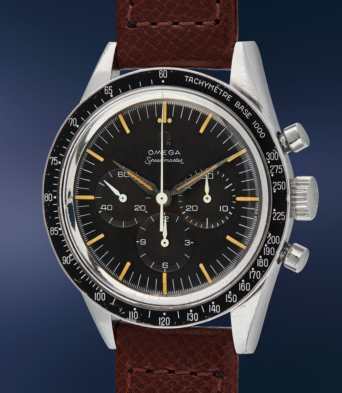 The reference 2998 was only in production for three short years with production ending in 1962. In that timeframe, small modifications to the design (different hands, bezels, or dials) were introduced, with each new iteration designated by the number after the hyphen in the reference number inscribed in the case back. The present watch, a highly desirable reference 2998-1, was the very first iteration of this reference. Eight case variations were made over the three years, (-1, -2, -3, -4, -5, -6, -61, -62), indicating how intensively Omega was honing the design of the Speedmaster – they clearly viewed the reference as integral to their success as a brand. The -1 variation is found with serial numbers between 17’301’xxx and 17-761’xxx with the present chronograph bearing movement no. 17’302’887 along with OXG import code for the American market.