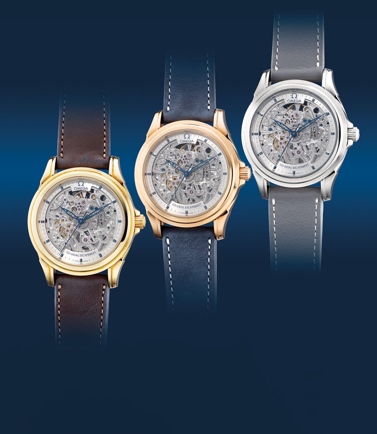 歐米茄,「DeVille Co-Axial Skeleton」型號,極度罕有重要,限量版一套三枚自動腕錶,備「Co-Axial」同軸擒縱機芯、鏤空錶盤、藍鋼指針,限量發行3套,編號3號,約2000年製。原裝證書、錶盒、配件