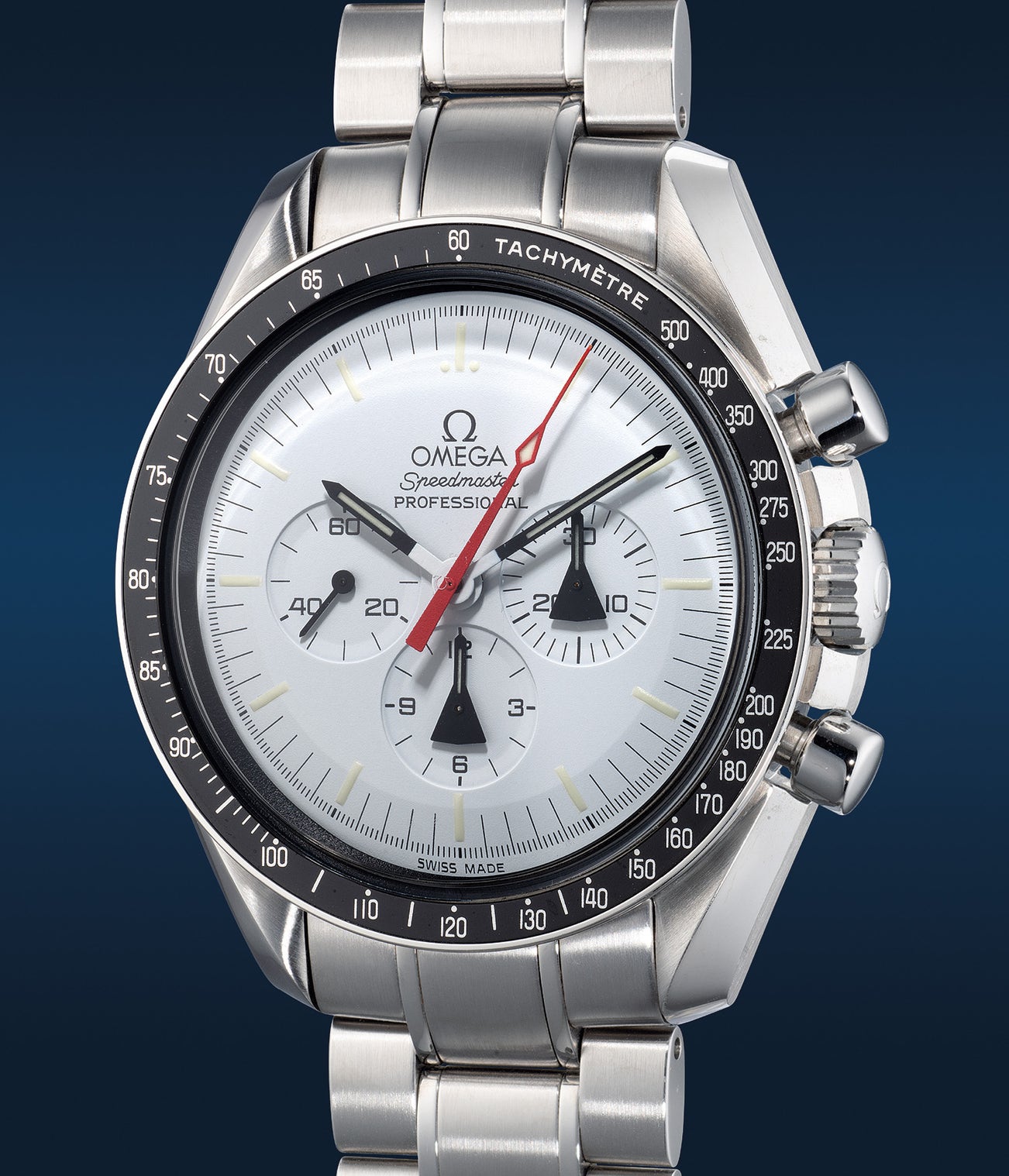 To celebrate this monumental legacy, Omega released a 1970-piece limited edition in 2008, as per the present example. The production number is a nod the year “Alaska II” commenced, which subsequently was the blueprint for the present reference. Adhering strongly to its predecessor, the modern interpretation bears a distinctive dial display, similar to its original which was developed in “space simulators” for optimised performance catered to the conditions in outer space. The reissued model is fitted with a white dial for increased sun heat reflection, a removable casing to act as a shield against extreme temperatures, along with small luminous chronograph hands.