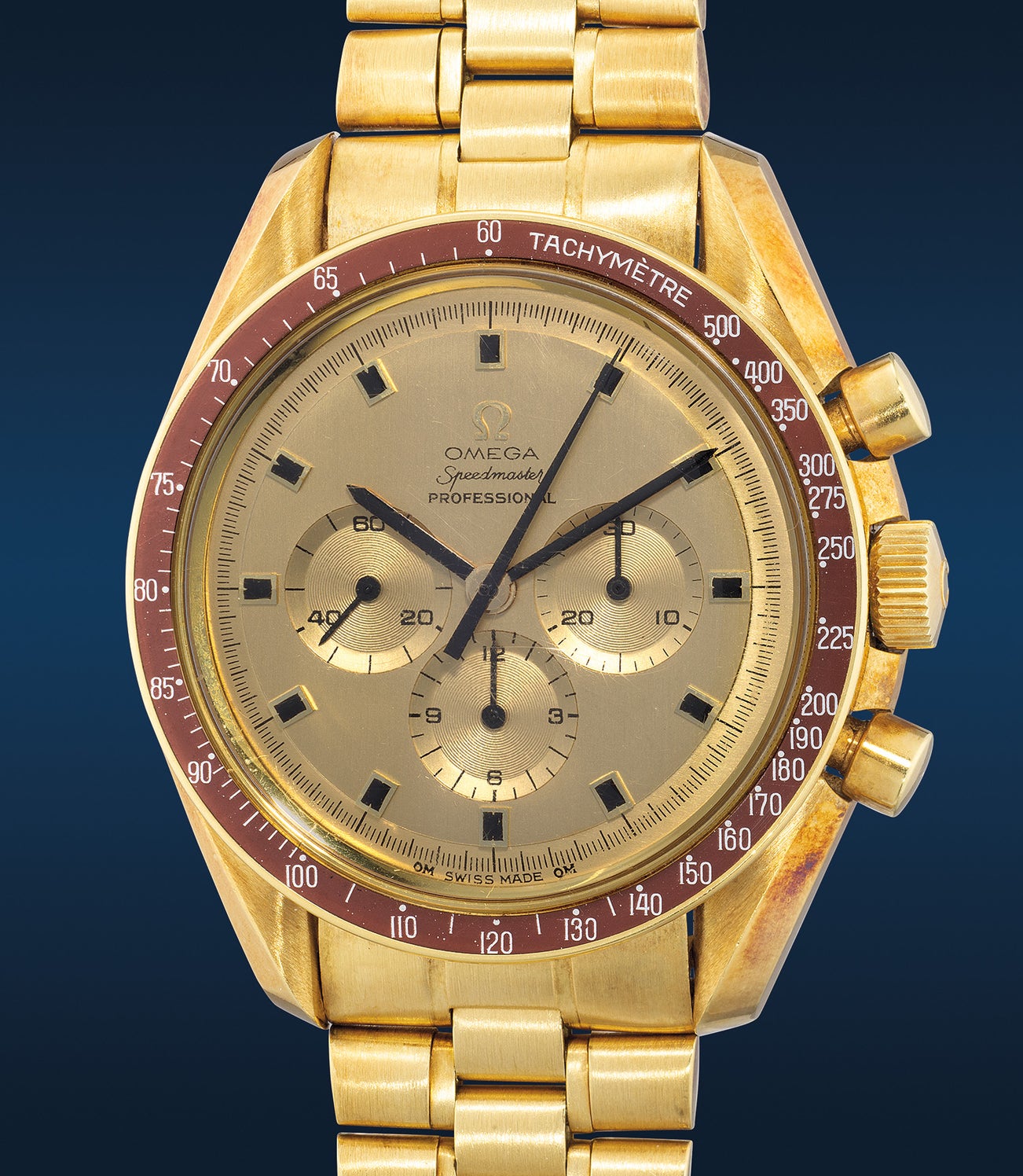 歐米茄,「Speedmaster Apollo XI 1969」型號BA 145.022-69,極度重要罕有,限量版黃金計時鏈帶腕錶,備黃金錶盤、酒紅色 錶圈,限量發行1014枚,編號12號,1969年製。附後補證書 — 原腕錶阿波羅12號宇航指揮官 Captain Charles “Pete” Conrad, Jr. 珍藏
