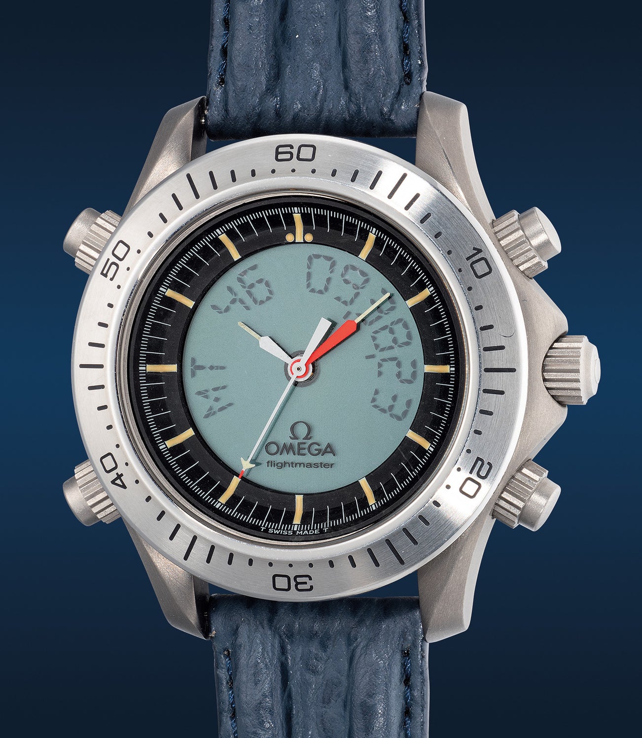 The X-33 Flightmaster prototype is identified by the larger red minute hand. Titanium was chosen as the ideal case material due to the fact that it is hypo-allergenic, non-ferrous, non-magnetic, light, and extremely robust. The watch also has analogue as well as digital display with many higher functions such as the display of military time, Universal Time (GMT) and mission elapse time (MET) with an alarm function for each. Two versions of the prototype were made. The first, produced in 100 examples, featured a single caseback, giving a low-decibel alarm. The present example is part of the second version prototype with a double caseback that amplified the alarm to 80 decibels. Only 22 examples of this version were produced, making this present timepiece an exceptionally rare development prototype for the multipurpose chronograph that was to become the Speedmaster X-33.