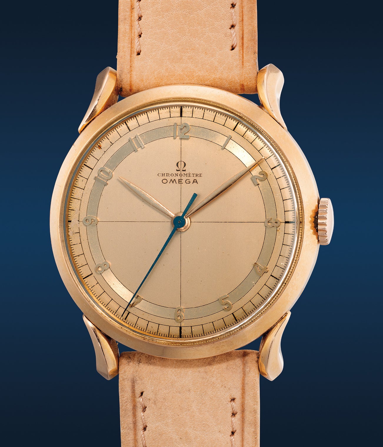 歐米茄,精細,玫瑰金大三針腕錶,備雙色錶盤、「Fancy」錶耳,1944年製。附後補證書