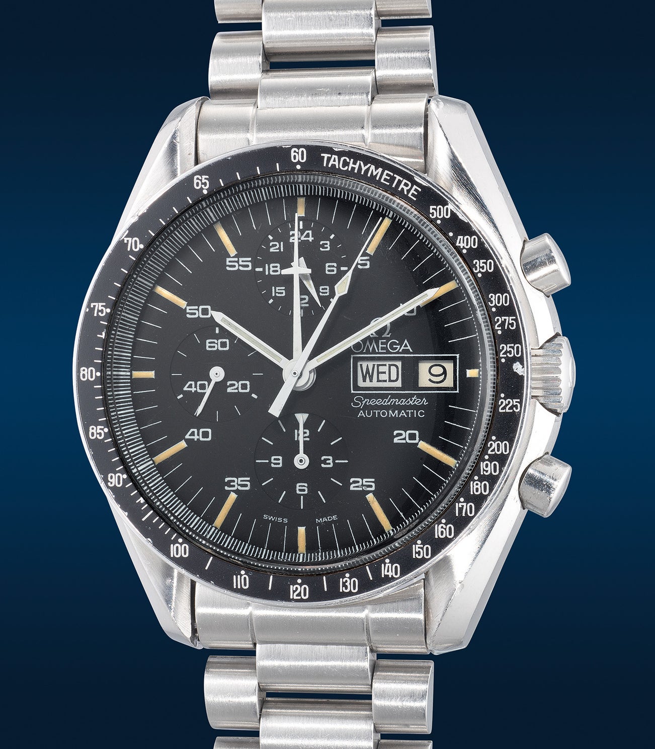 歐米茄,「Speedmaster, The Holy Grail」型號ST 376.0822,精細及非常罕有,精鋼自動計時鏈帶腕錶,備日期、星期、24小時顯示,1988年 製。附後補證書、備用鏈帶、