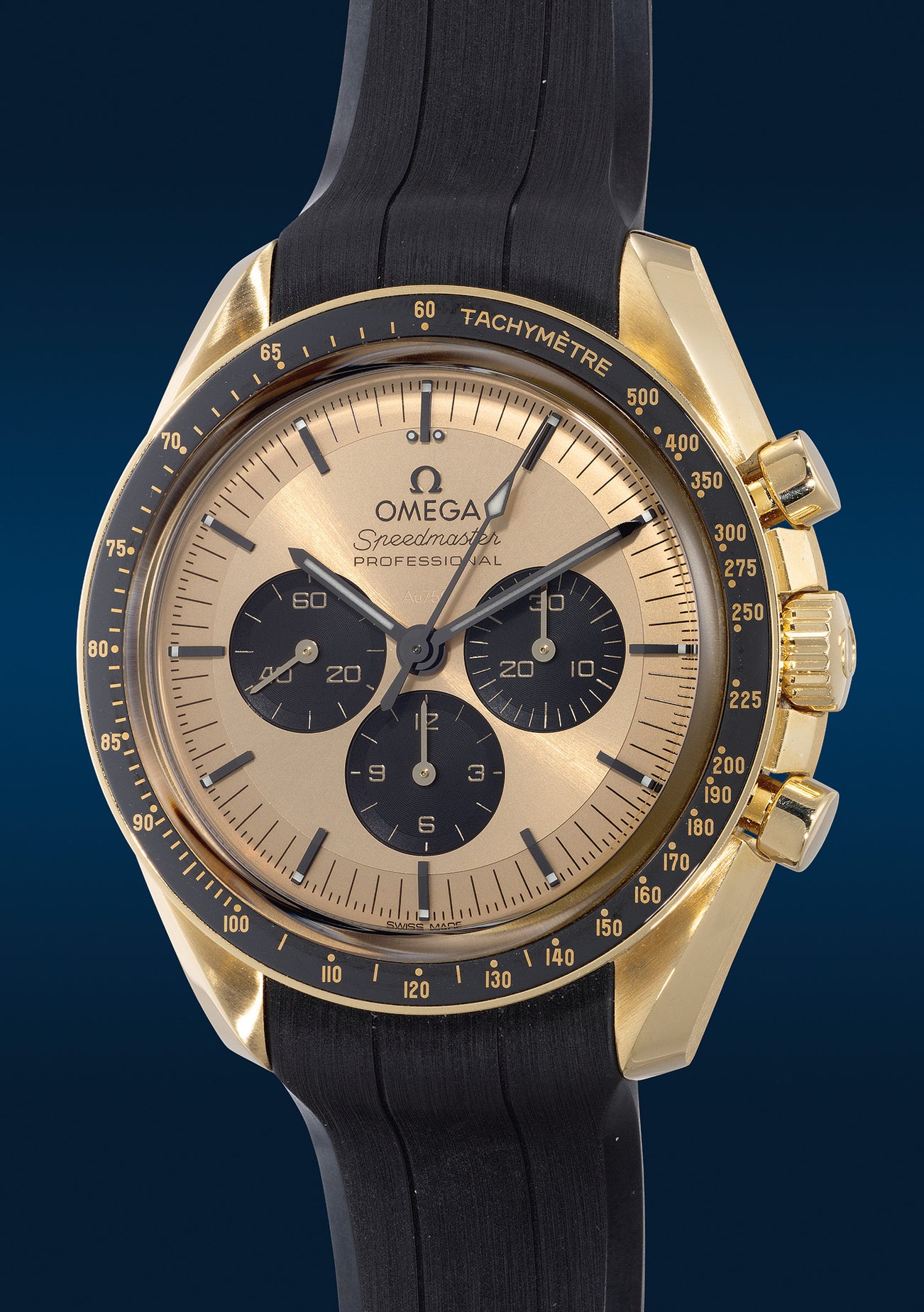 歐米茄,「Speedmaster "Moonshine Panda"」型號 310.62.42.50.99.001,精細,「Moonshine」金計時腕錶,備黑陶瓷錶圈,約2022年製。附原裝證書、配件、錶盒