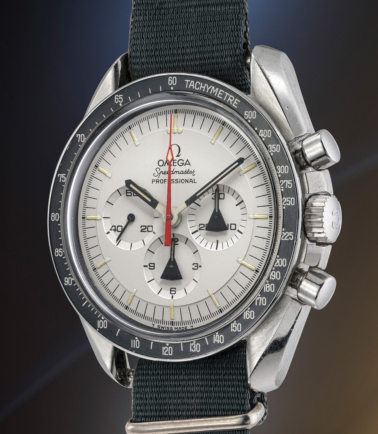 In the early 1970s, Omega began work on a continuation of its secret project, now internally titled “ALASKA II”, which involved several studies and prototypes. The present lot belongs to the first batch of “ALASKA II” prototypes - delivered in 1970 - and is closely related to the production Speedmaster Professional, with less changes than those of the earlier project of 1969. It paired most of the tested technologies of “ALASKA I” with the trusted and legendary Speedmaster “Moonwatch” case of the (then) current reference ST 145.022. The special characteristics of the watch are aimed at improving legibility and usage in space. For example the white dial was considered more readable and the same holds true for the oversized subsidiary dials hands (aptly dubbed “Apollo” hands by Omega). Additionally, some examples are known to have a red anodized aluminum outer protective case.