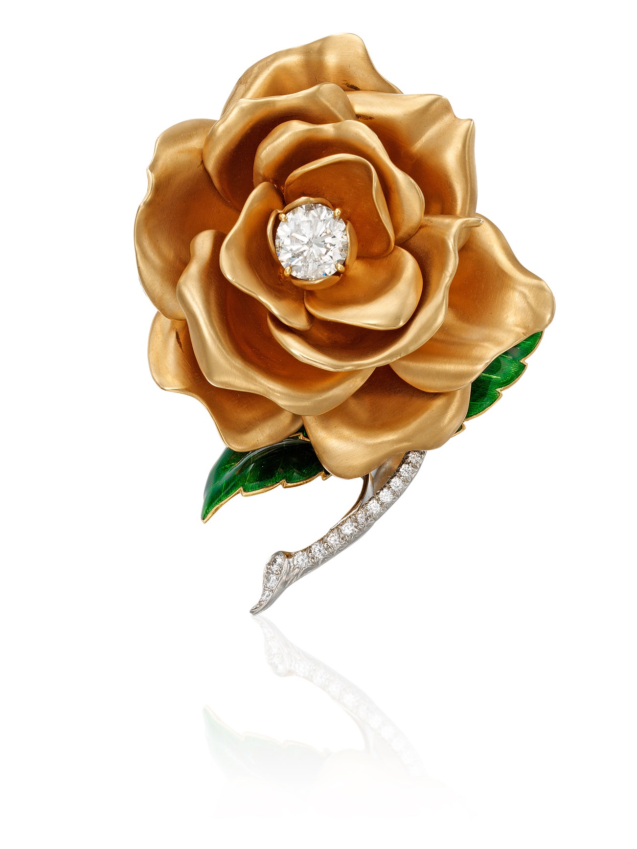 Modeled as a rose, set with a brilliant-cut diamond cradled in gold petals, accented by a brilliant-cut diamond set stem with green enamel leaves, mounted in 18k yellow gold and platinum, maker's mark, numbered.