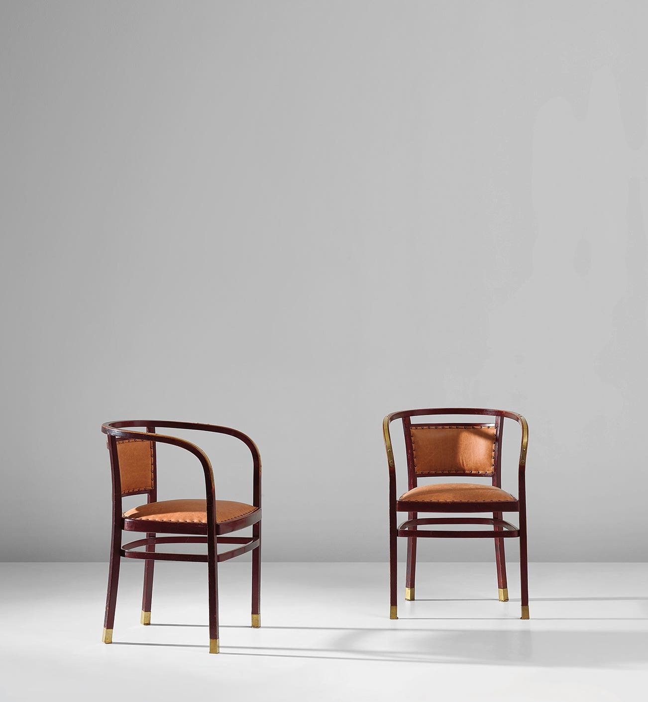 The present lot is a variant of the armchair Otto Wagner designed in 1902 for the news agency ‘Die Zeit’ in Vienna. In keeping with the predominantly silver, black and dark brown colour scheme of the news agency’s interior, Wagner used aluminium fixtures for the armchairs. The model subsequently went into production with the manufacturer Jacob and Josef Kohn with brass fixtures, which was thought to be more desirable. As published in the 1916 Kohn catalogue, model no. 718/F, the present lot shows a backrest matching the seat upholstery with leather and brass nailheads.