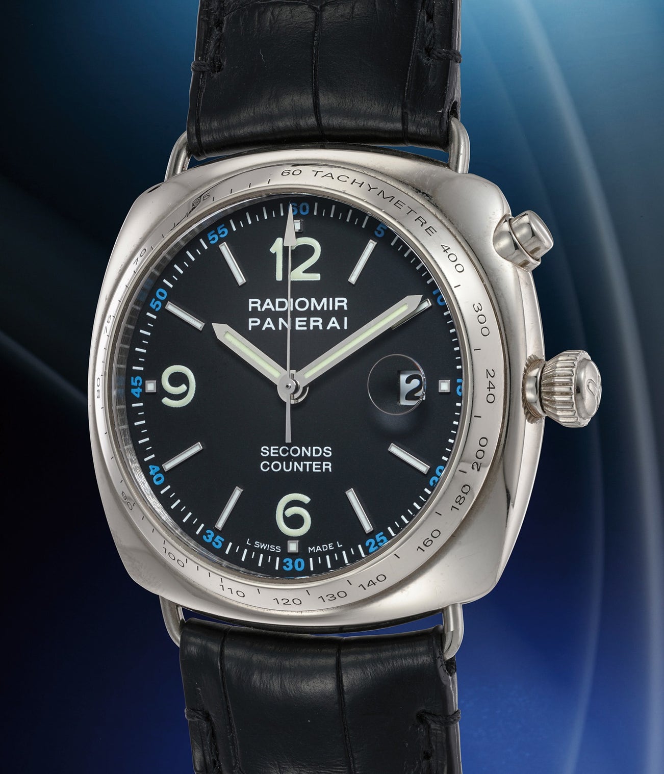 Known for producing some of the world's most important military and diving watches, the company has released sophisticated editions of the Radiomir and Luminor throughout its history, with a focus on technical innovation. With an original Panerai cushion-shaped case and legible dial, the timepiece remains true to the manufacture's DNA. Upon closer inspection, one can not avoid but notice the engraved tachymeter scale elegantly contrasting the white gold case as well as the interesting and unusual seconds counter function (mechanism used for the precise measuring of seconds within a minute, activated through the push of one single button). With a small cyclope at 3 o'clock, this Panerai really stands out from the usual diver wristwatches. Produced in an extremely limited series of only 75 timepieces and presented in overall excellent condition, the watch is a must have for any collector looking for innovation and rarity within the Panerai watchmaking series.