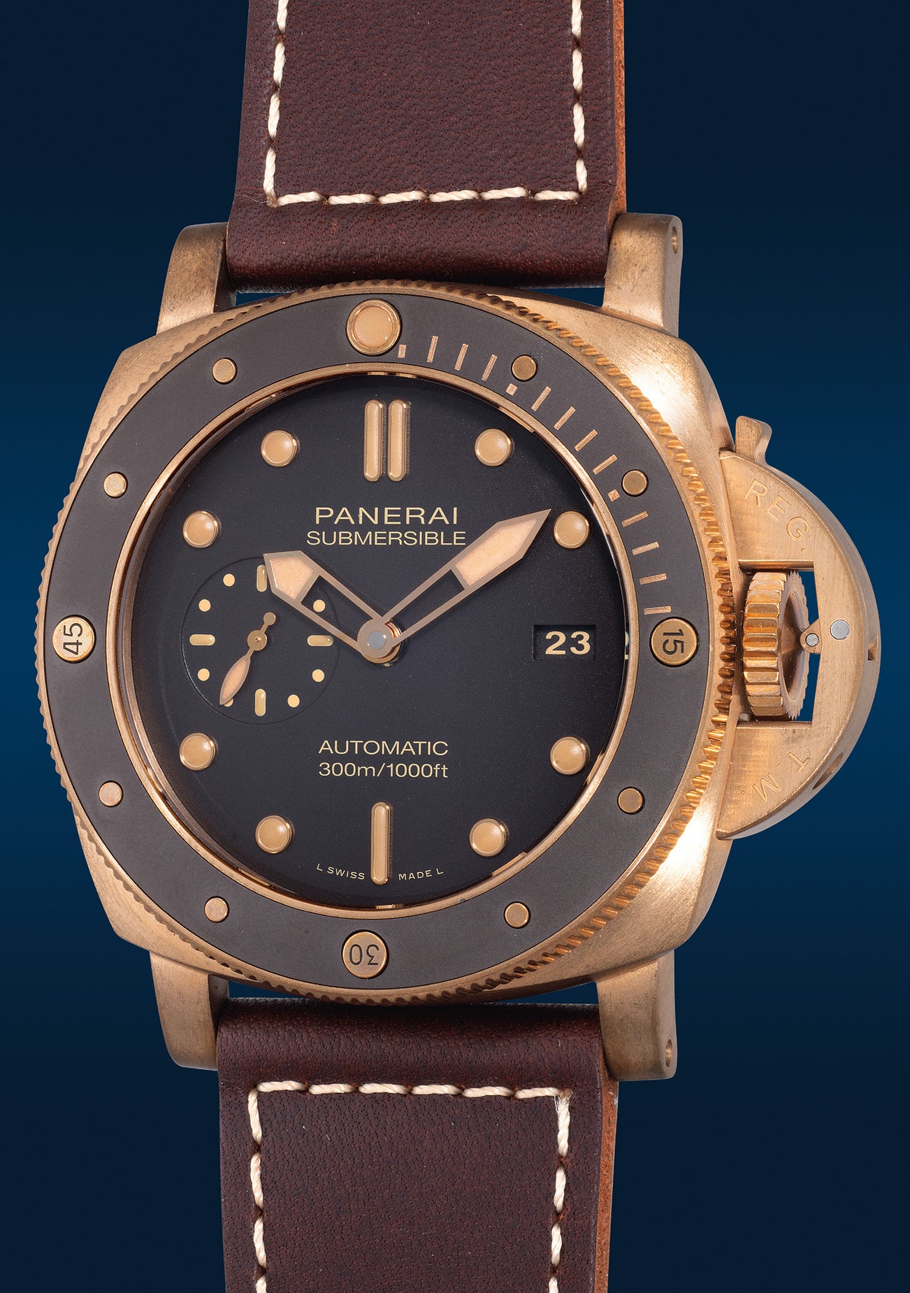In 2011, the Submersible Bronzo debuted, encased in a 47mm bronze case with a titanium caseback. Nicknamed "Bronzo" after the Italian word for bronze, it housed Panerai's in-house cal. 9010 with 3 days of power reserve.