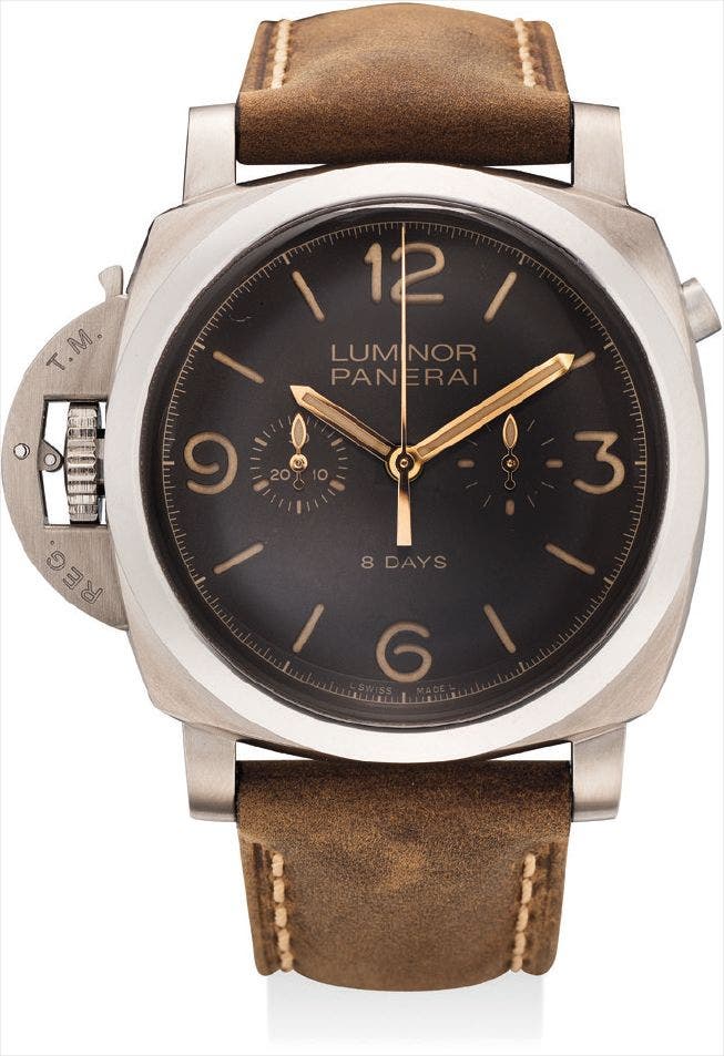 沛納海,罕有,鈦金屬單按鈕枕形左手腕錶,配計時功能及8天動力儲存,“Luminor 1950 Chrono Monopulsante Left-handed 8 Days Titanio”,型號PAM00579,限量生產,2015年製