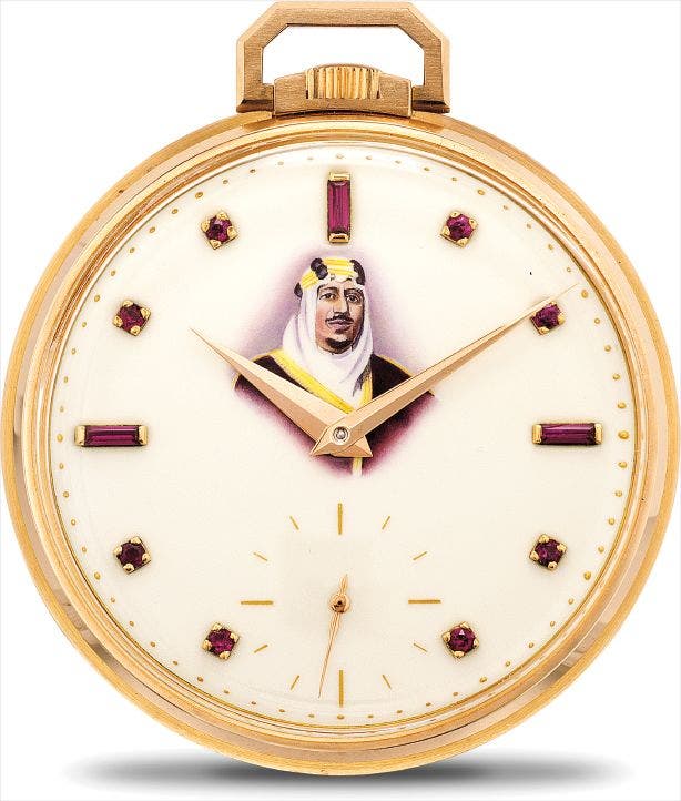 百達翡麗,非常精細及罕有,18K紅金懷錶,配紅寶石琺瑯錶盤,錶盤描繪King Saud bin Abdul Aziz,型號600/1,1955年製