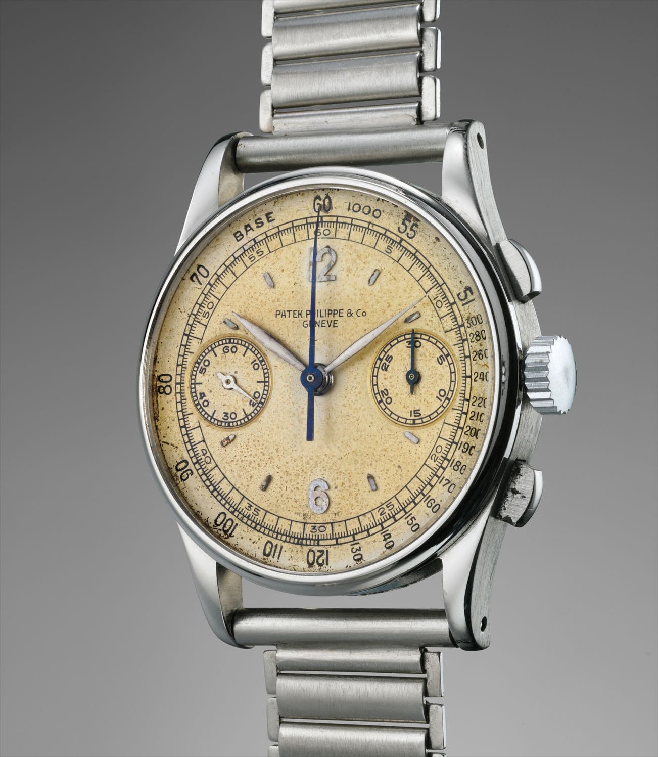 The present example, cased in stainless steel is fresh to the market and features an element not found in its gold counterparts: shorter and thicker lugs giving the watch a sportier and more masculine appearance, which is further highlighted by the steel Gay Frères bracelet. The cream dial has aged to a magnificent ivory color giving the watch the allure of a bygone era. As one would expect from a Patek Philippe made in 1941, the dial features the long signature, Patek Philippe & Co.