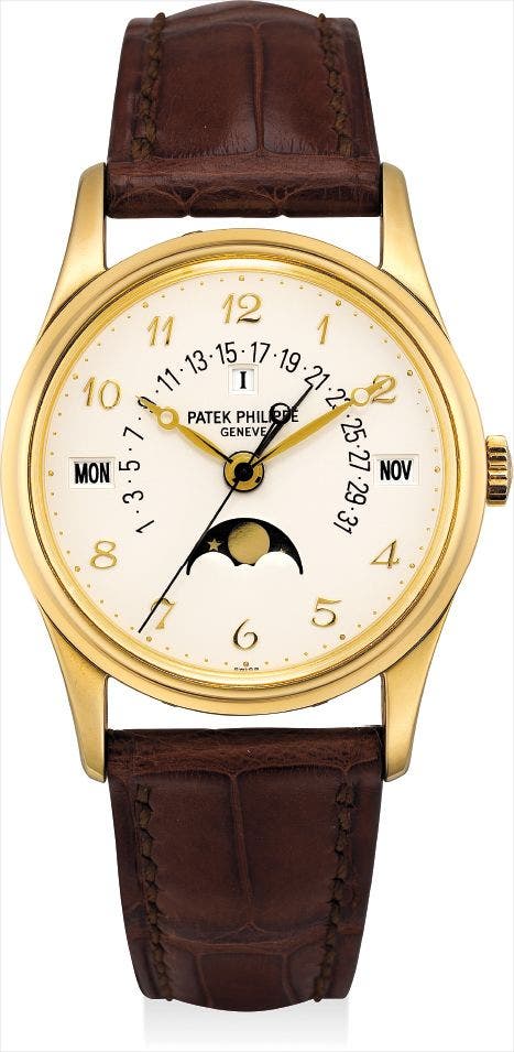 百達翡麗,精細及罕有,18K黃金自動上弦腕錶,配萬年曆、中心秒針、逆返日曆、月相及閏年顯示,型號5050,附證書及底蓋,2008年製