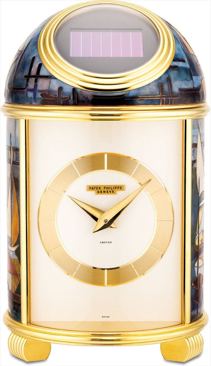 百達翡麗,極精細及獨特,鍍銅太陽能座鐘,配懷錶機芯及Madame Luce Chappaz 所繪的掐絲琺瑯彩繪,型號766,由卡地亞銷售,1969年製