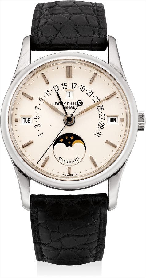 百達翡麗,精細及罕有,鉑金自動上弦腕錶,配萬年曆、中心秒針、逆返日曆、月相及閏年顯示,型號5050,附證書,1994年製