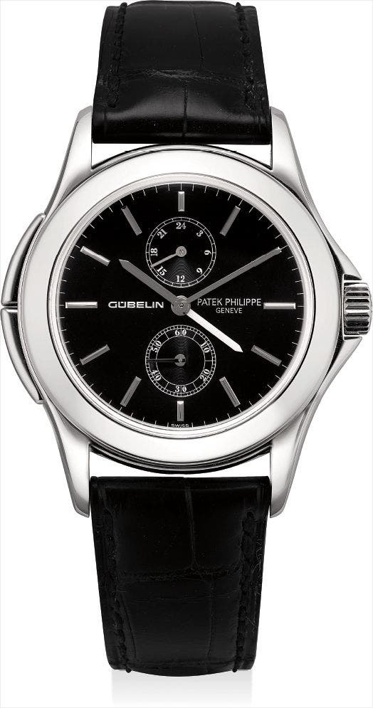 百達翡麗,精細及非常罕有,鉑金腕錶,配兩地時間及24小時顯示,“Travel Time”,型號5134,限量生產,為慶祝Gubelin150週年於2003年製